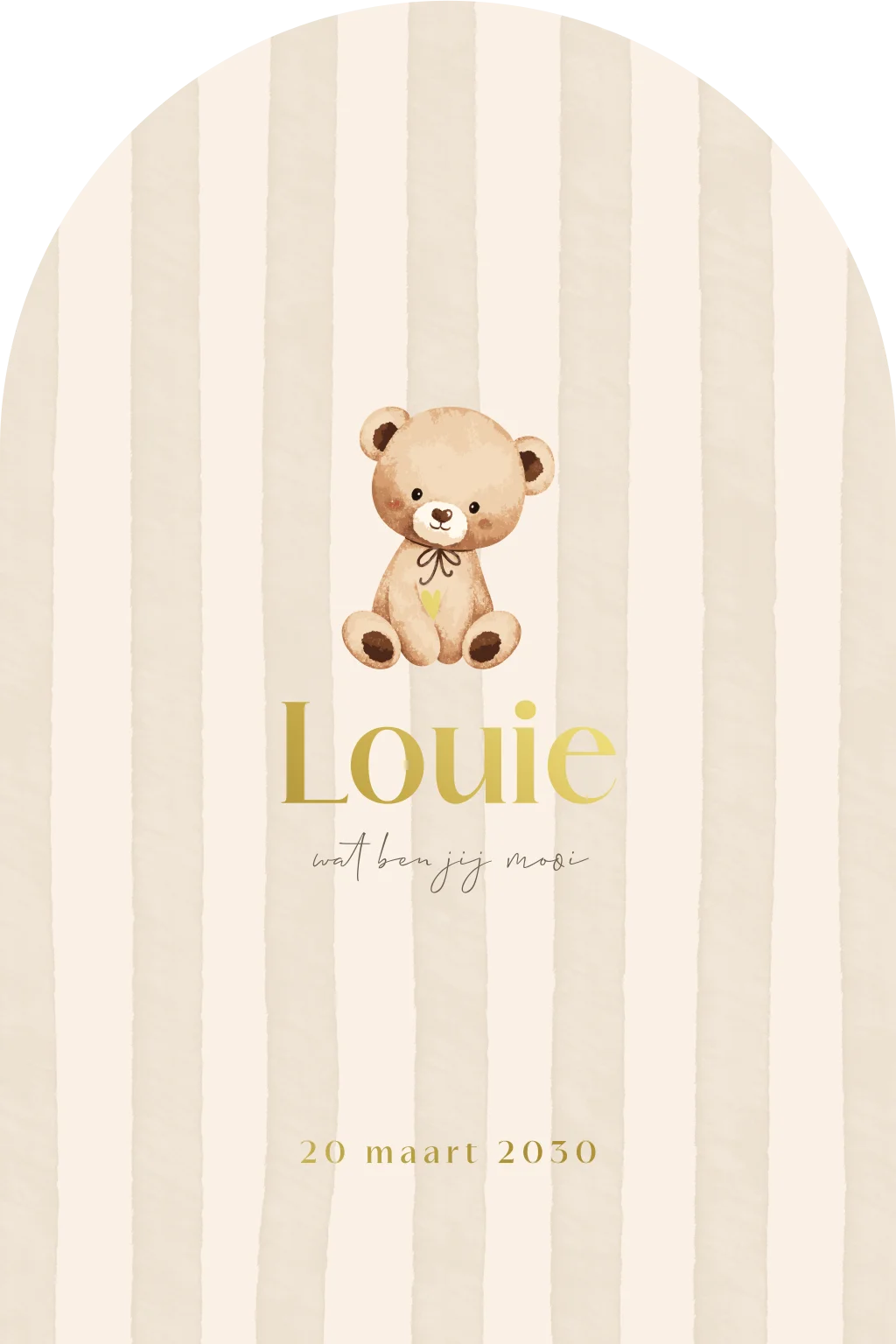 Uniek unisex geboortekaartje voor een jongen of een meisje. Dit geboortekaartje heeft een dubbele boogvorm wat het kaartje helemaal uniek maakt. Het ontwerp is lief met een schattig teddybeertje. De achtergrond heeft beige strepen en de glanzende goudfolie maakt het geheel helemaal af. Pas deze kaart naar je eigen smaak aan in de editor en combineer met een mooie envelop en sluitzegel om het helemaal af te maken.