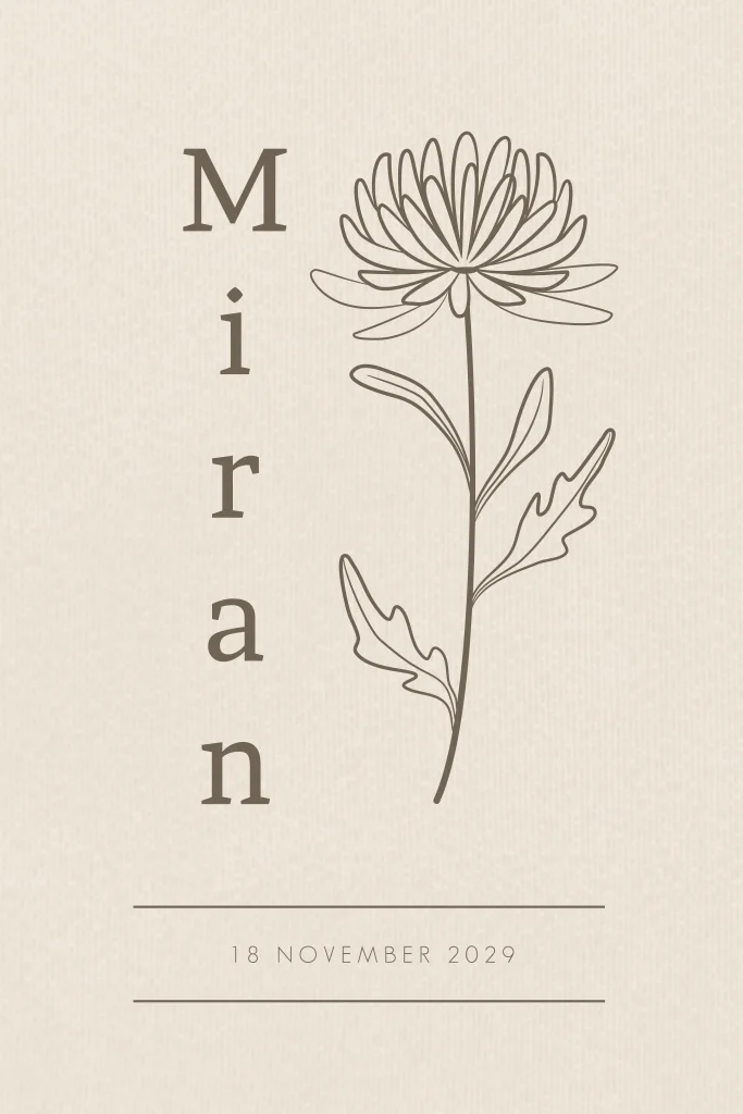 Wanneer je op zoek bent naar een rustig en neutraal geboortekaartje dan is dit geboortekaartje Miran met geboortebloem echt iets voor jou. Deze kaart is eenvoudig, maar toch heel stijlvol. De achtergrond heeft subtiele lijntjes met een lijntekening van de geboortebloem chrysant, passend bij de geboortemaand november. Dit geboortekaartje is geschikt voor zowel een jongen als een meisje. Pas de teksten, kleuren en lettertypen eenvoudig aan in de editor.