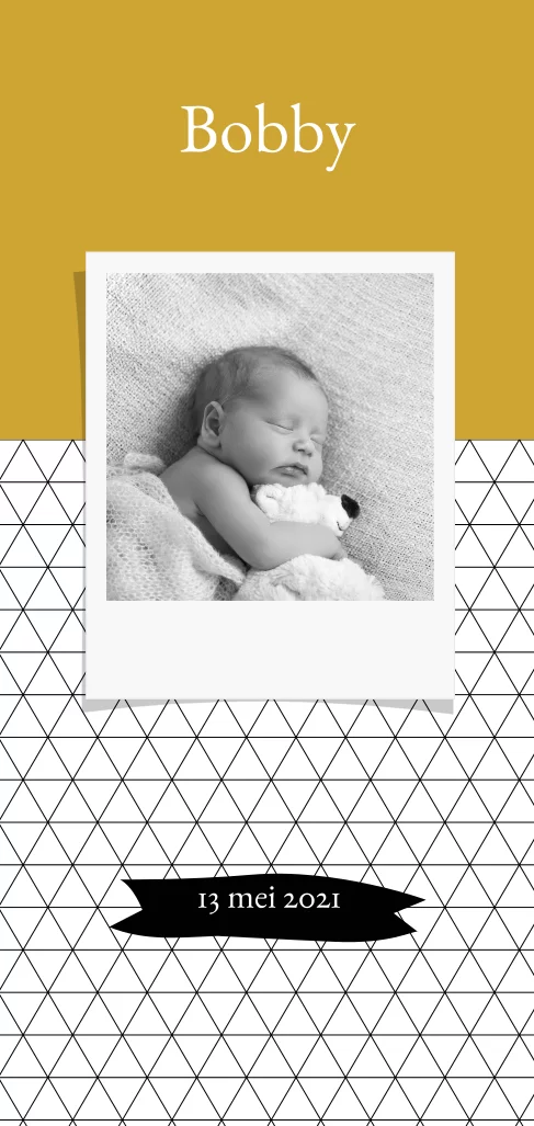 Dit gender neutrale (of unisex) foto geboortekaartje heeft speelse geometrische lijnen. De combinatie van het okergeel en de geometrische vlakken maken dit baby kaartje een beetje stoer. De baby foto op de voorzijde geeft de kaart een persoonlijk tintje.