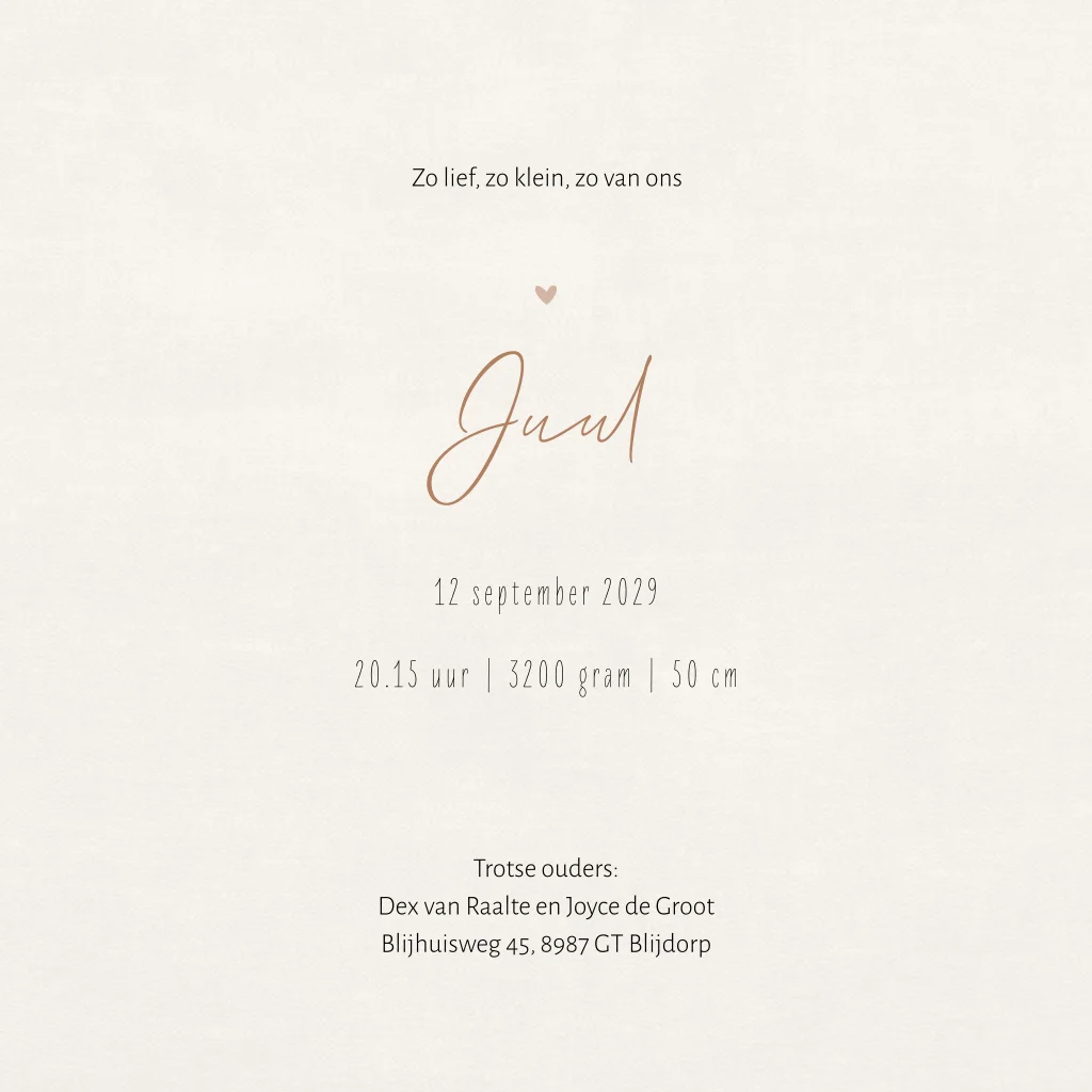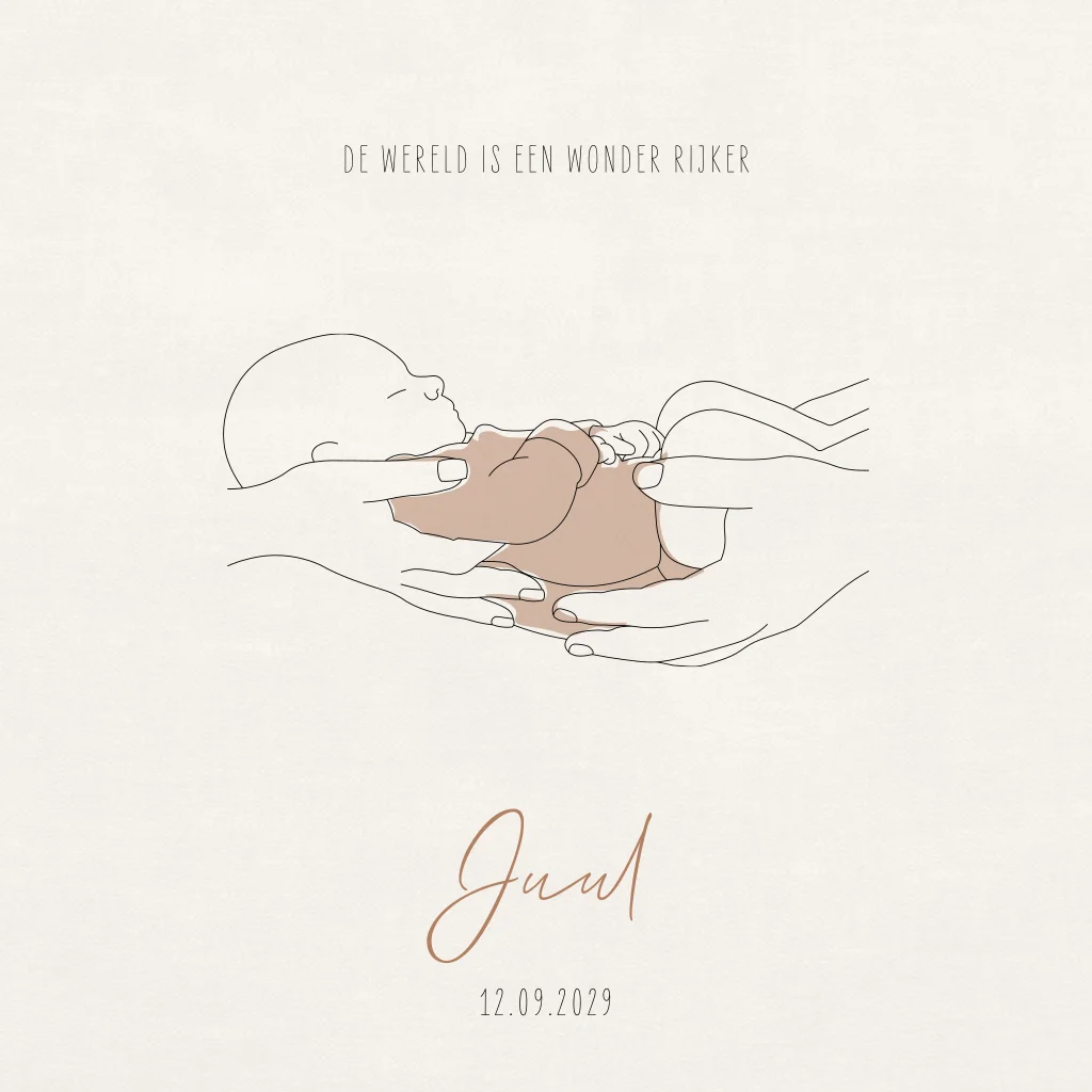 Neutraal unisex geboortekaartje met een mooie lijntekening en een lichte linnen achtergrond. Dit babykaartje Juul heeft een rustige uitstraling en kun je naar je eigen smaak aanpassen. De subtiele illustratie is van een baby die wordt vastgehouden en gedragen door twee handen. Aan de binnenkant is een lijn tekening van een slapende baby samen met een knuffeltje.