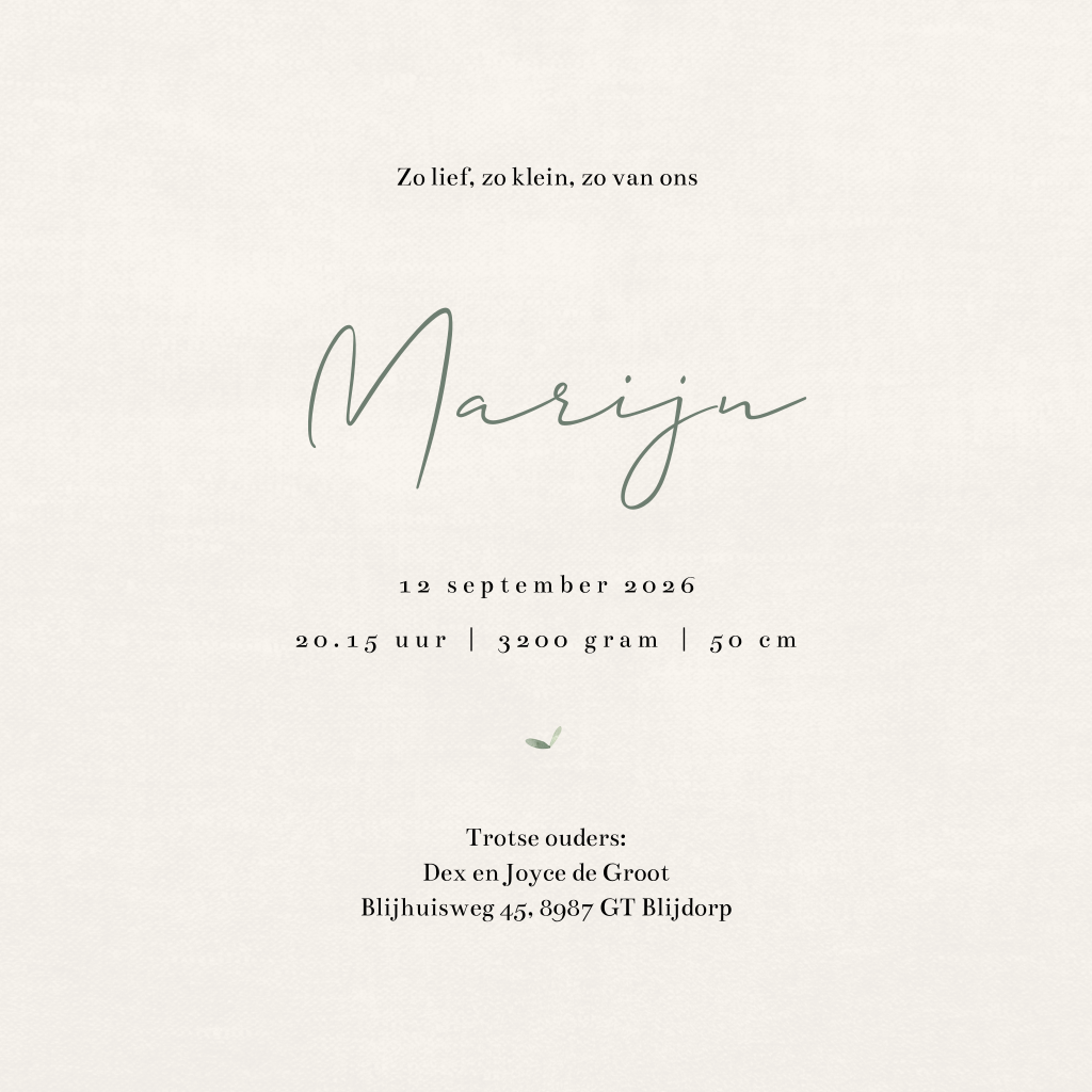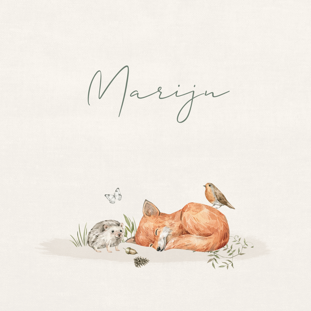 Lief unisex geboortekaartje met bosdieren. Op dit nude geboortekaartje zie je een illustratie van een vosje, egel, roodborstje en vlinder. Dit rustige geboortekaartje Marijn is zowel geschikt voor een jongen als meisje en kun je naar eigen smaak aanpassen in de editor. Hulp nodig? We helpen graag!