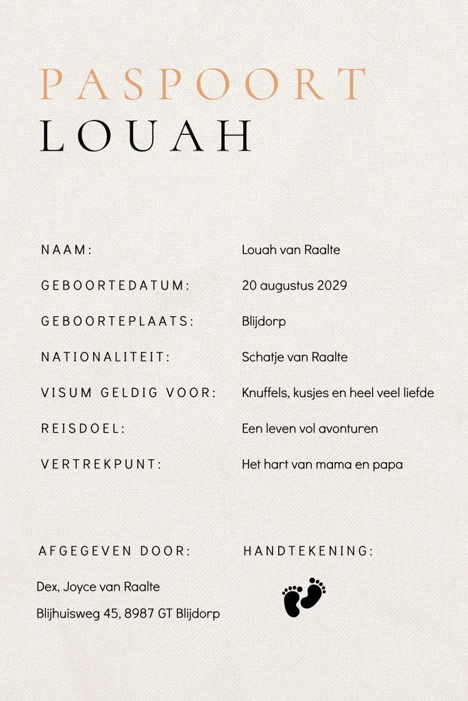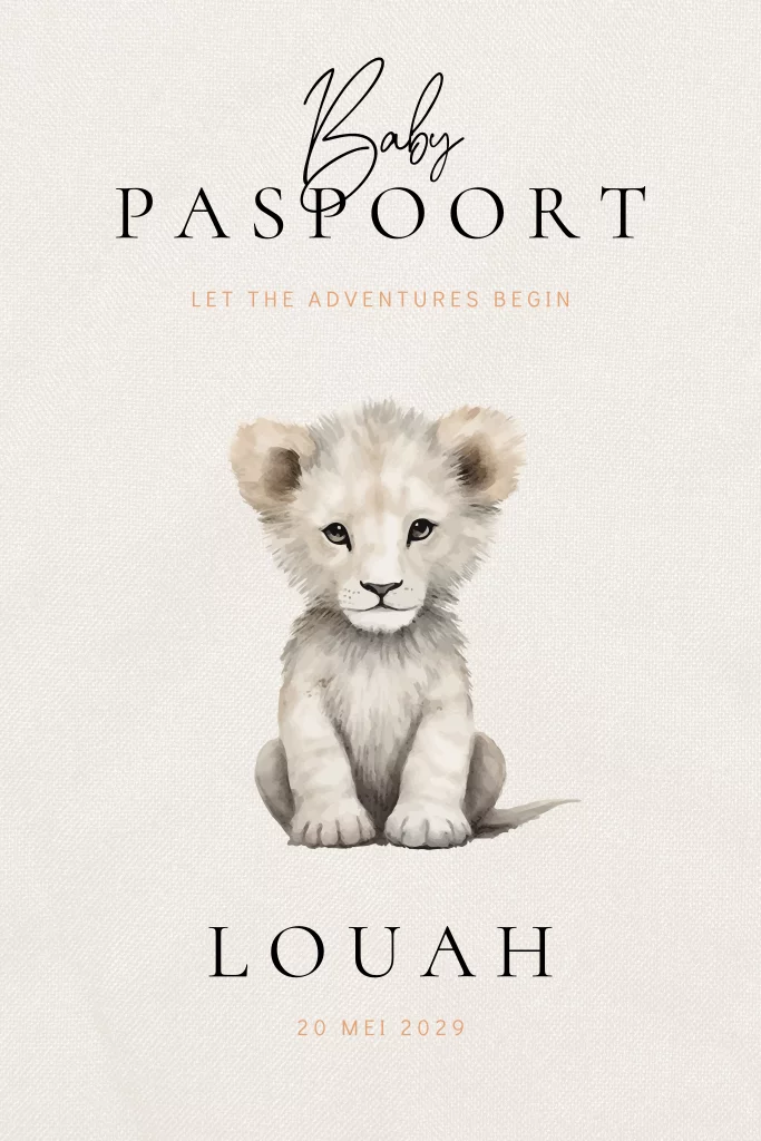 Een paspoort geboortekaartje voor een jongen of meisje. Dit unisex geboortekaartje Louah heeft de vorm van een paspoort. Op de voorzijde staat een lief leeuwtje. In de binnenzijde kun je een eigen foto toevoegen van jullie kindje. Pas dit paspoort geboortekaartje voor jullie zoon of dochter naar eigen wens aan in onze online editor.