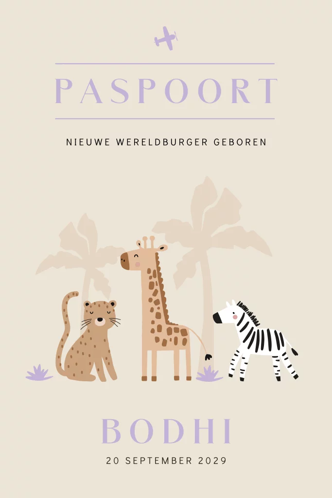 Een paspoort geboortekaartje voor een jongen of meisje. Dit unisex geboortekaartje Bodhi heeft een prachtig reisthema. Op de voorkant van het kaartje zie je een illustratie van verschillende safari dieren, een panter, giraffe en zebra. In de binnenzijde kun je een eigen foto toevoegen van jullie kindje.
