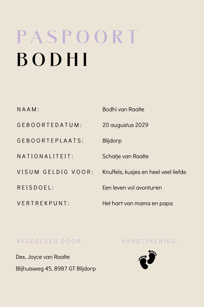 Pas dit paspoort geboortekaartje voor jullie zoon of dochter naar eigen wens aan in onze online editor. Met de lavendel kleurige envelop maak je deze kaart met afgeronde hoeken helemaal in stijl af.