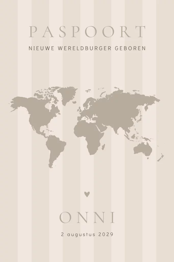 Paspoort geboortekaartje unisex met strepen en wereldkaart