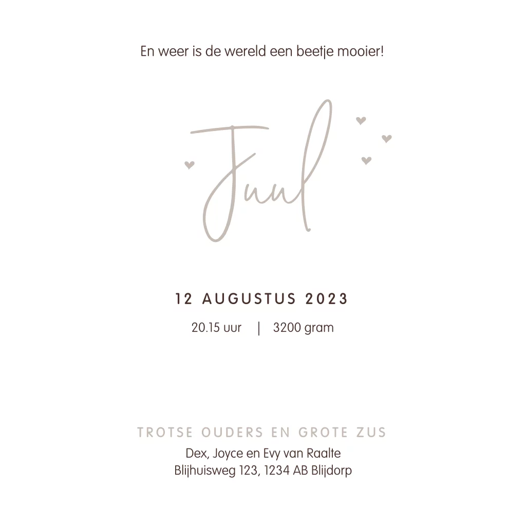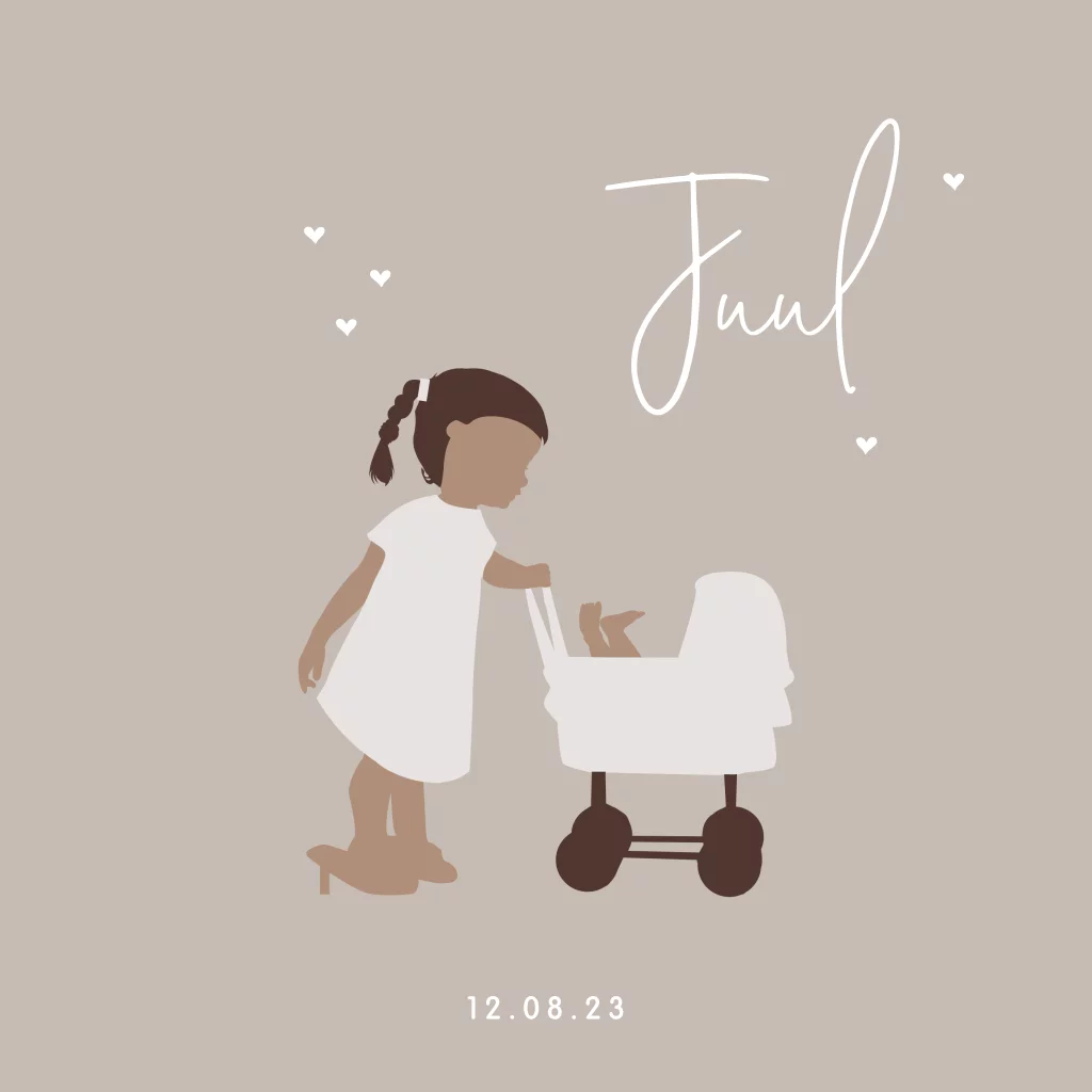 Ton sur ton geboortekaartje voor een baby zusje of een baby broertje met een afbeelding van een grote zus en een wandelwagen. Twee kleine babyvoetjes steken uit de wandelwagen. De naam Juul staat in sierlijke letters op dit gender neutrale babykaartje. De ton sur ton kleuren in beige tinten zorgen voor een rustige uitstraling. Pas de teksten en lettertypes naar wens aan in de editor.