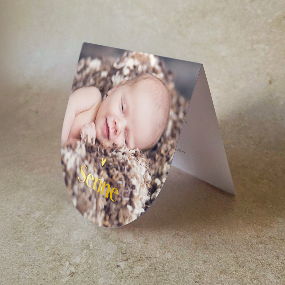 Origineel en luxe geboortekaartje voor een jongen of een meisje. Dit geboortekaartje Senne is unisex en heeft een aparte vorm. Zet een mooie foto van jullie pasgeboren baby op de kaart. De goudfolie geeft een extra luxe touch en mooie glanzende afwerking.