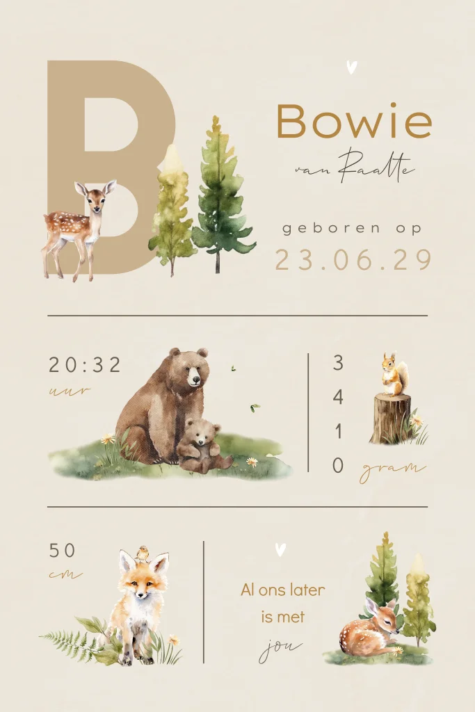 Typografisch unisex geboortekaartje met bosdieren en geboortegegevens