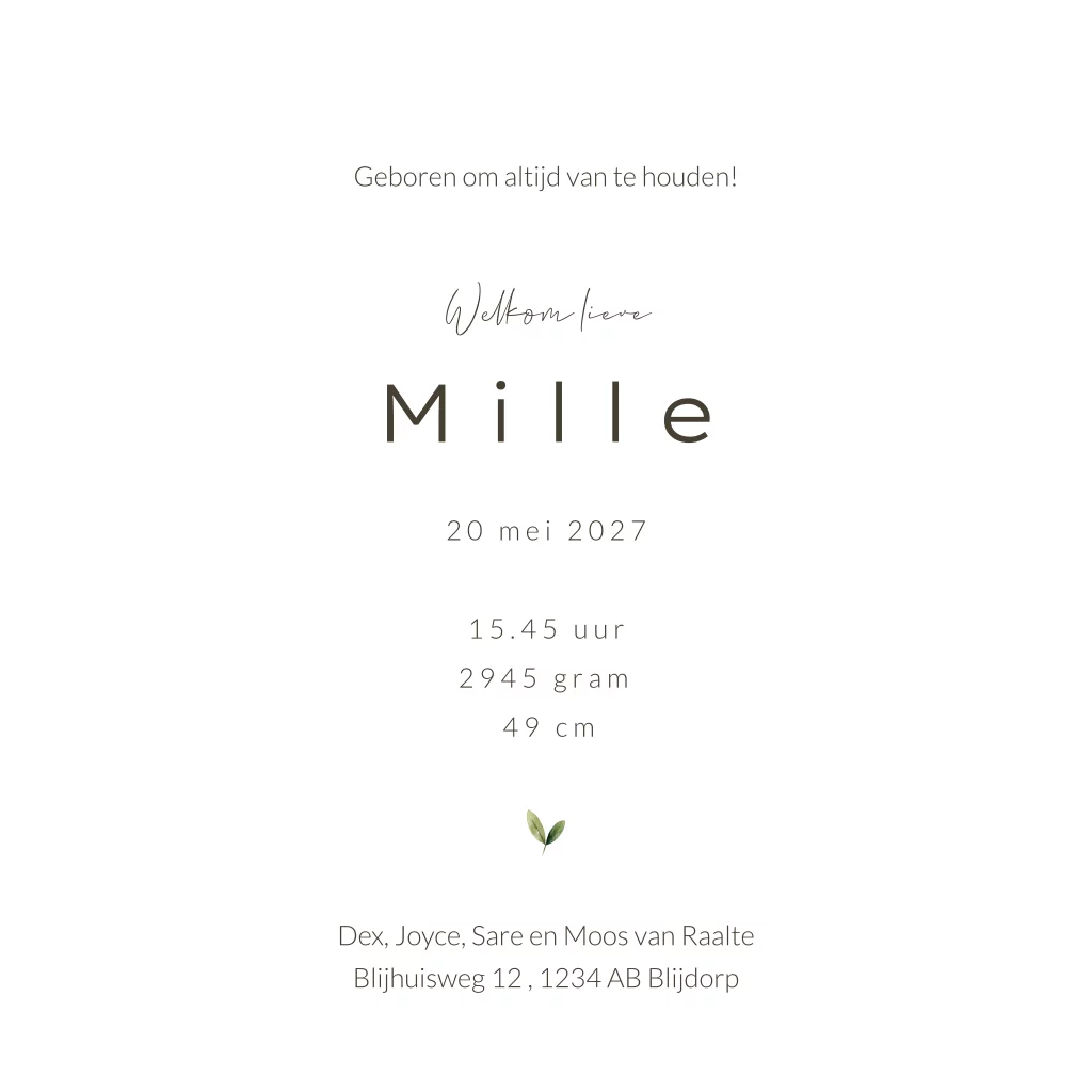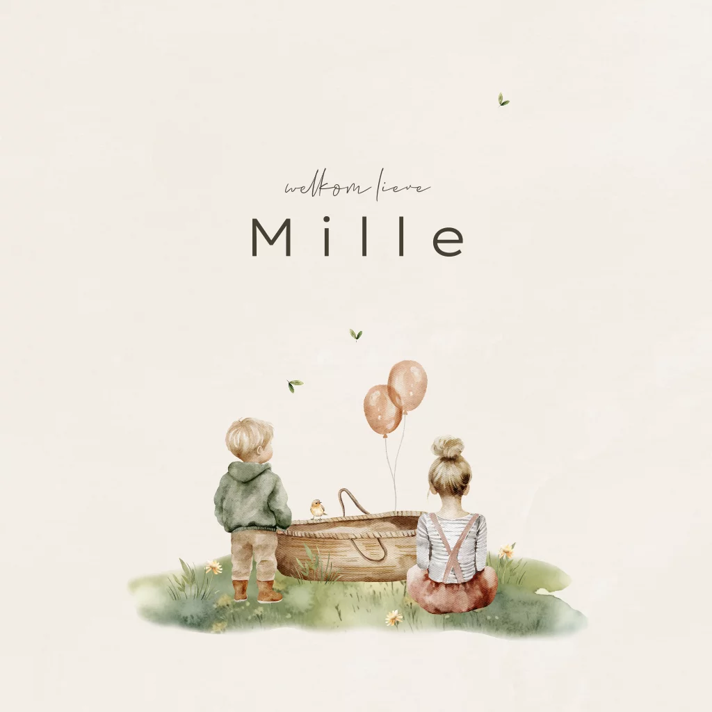 Unisex geboortekaartje met een aquarel ontwerp met een lieve afbeelding van een broer en zus bij een baby mand met hun kleine broertje of zusje erin. Aan de mand hangt een ballon. Dit geboortekaartje Mille is ideaal voor gezinnen die een derde kindje verwachten. De getekende illustratie geeft een warm en knus gevoel, wat perfect past bij de komst van jullie nieuwe gezinslid. De neutrale kleuren maken dit kaartje geschikt voor zowel jongens als meisjes, waardoor het een unisex ontwerp is.