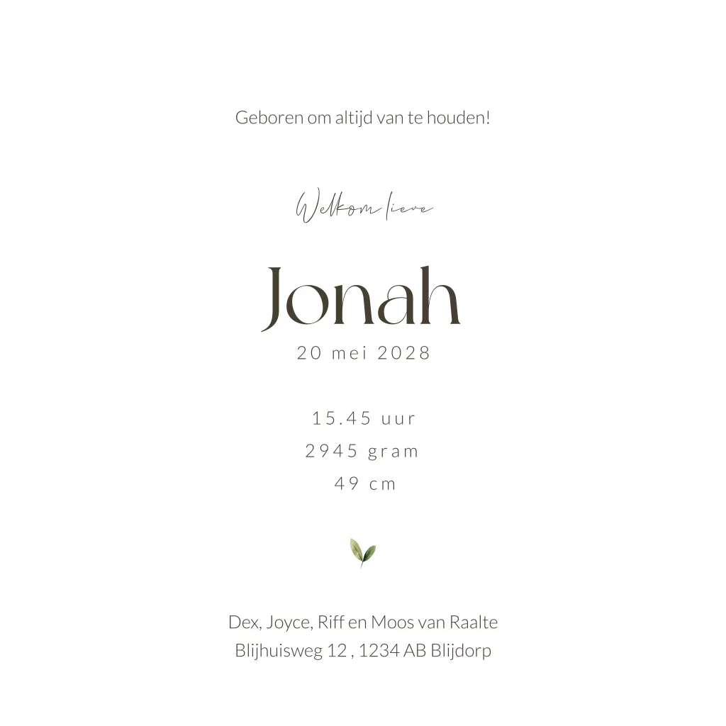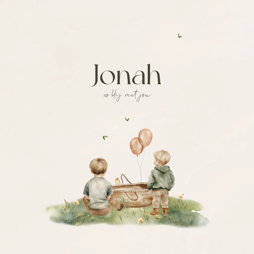 Of jullie nu een zoon of dochter verwachten, dit geboortekaartje is een prachtige keuze om de komst van jullie derde kindje aan te kondigen. Het geboortekaartje Jonah heeft een aquarel ontwerp van twee broertjes die bij de rieten mand van hun broertje of zusje staan te kijken. Aan de rieten mand hangen twee feestelijke ballonnen en op de mand zie je een schattig roodborstje zitten. Op de achtergrond van het geboortekaartje zie je een paar blaadjes voorbij waaien. Leuk voor een kindje dat in de lente wordt geboren.