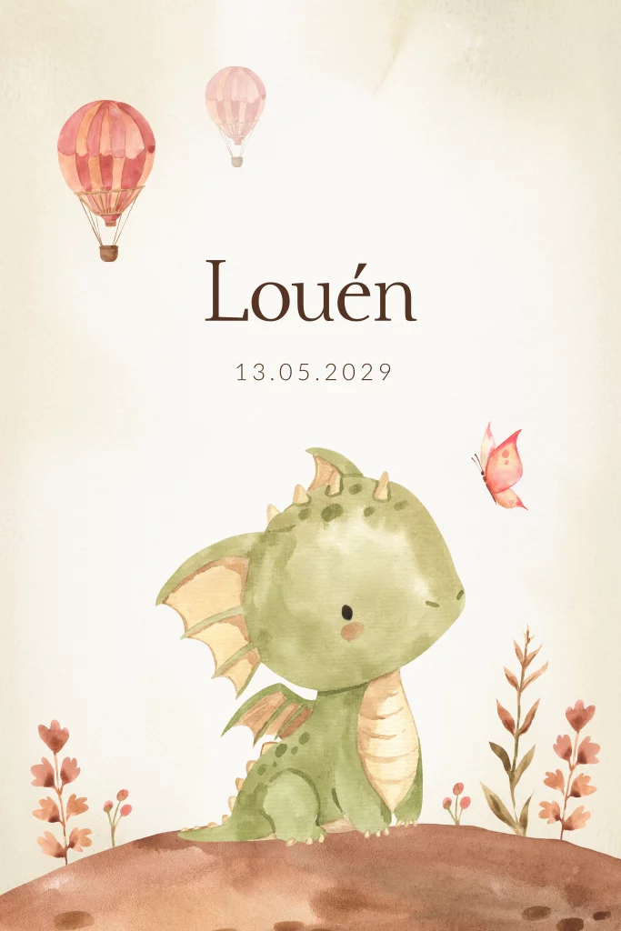 Op dit unisex geboortekaartje Louén zie je een aquarel tekening van een schattig draakje. De achtergrond heeft een zachte kleuren met luchtballonnen en een vlindertje. Pas dit gender neutrale geboortekaartje geheel naar eigen wens aan in de editor. Ook kun je zelf bepalen of je ronde hoeken wilt. Pas dit gemakkelijk aan in de editor.