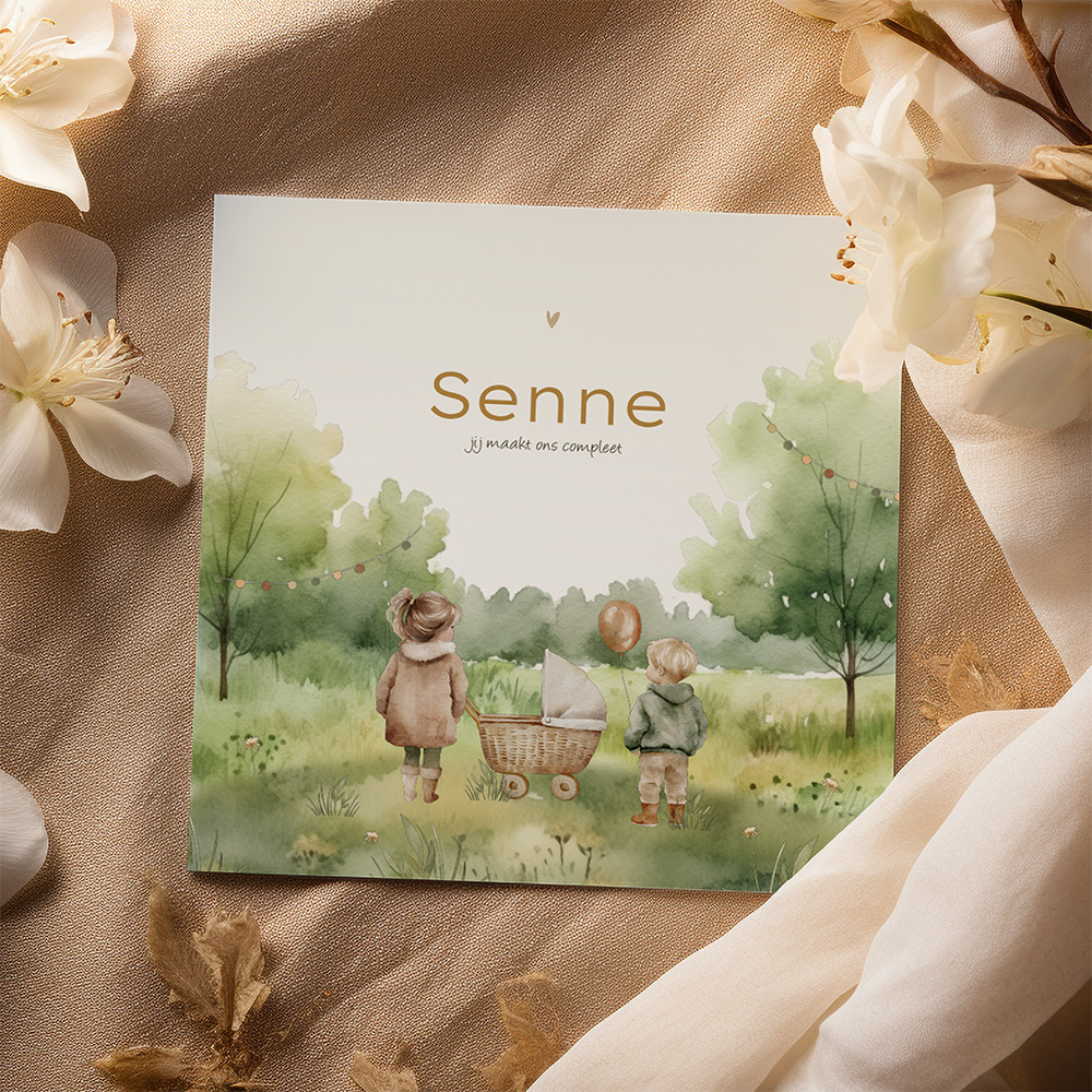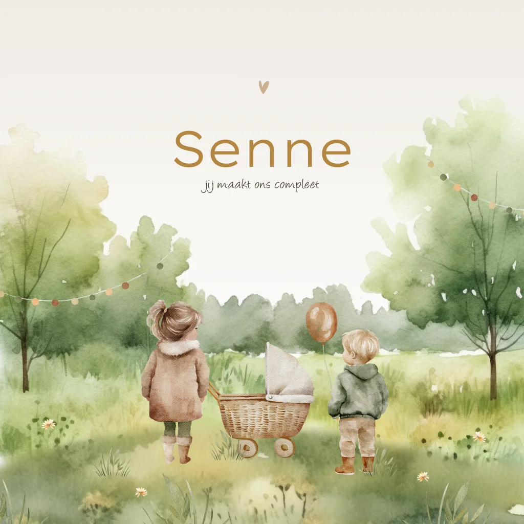 Unisex geboortekaartje met een aquarel getekend ontwerp met een groen landschap, perfect voor de aankondiging van de geboorte van jullie derde kindje. De tekening van een grote broer en zus en hun kleine baby broertje of zusje in een kinderwagen straalt warmte en liefde uit. De zachte kleuren en illustratieve stijl geven een vleugje vintage charme aan dit geboortekaartje.
