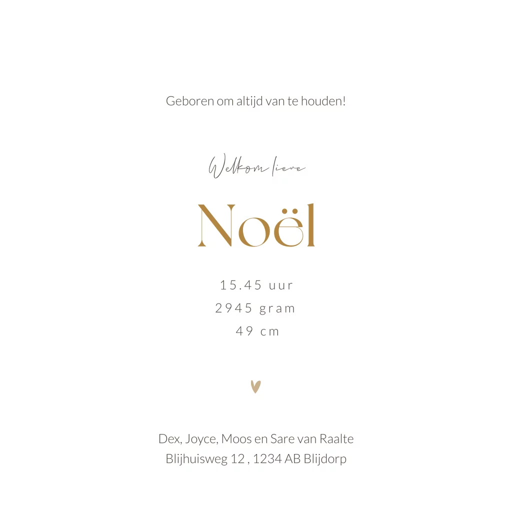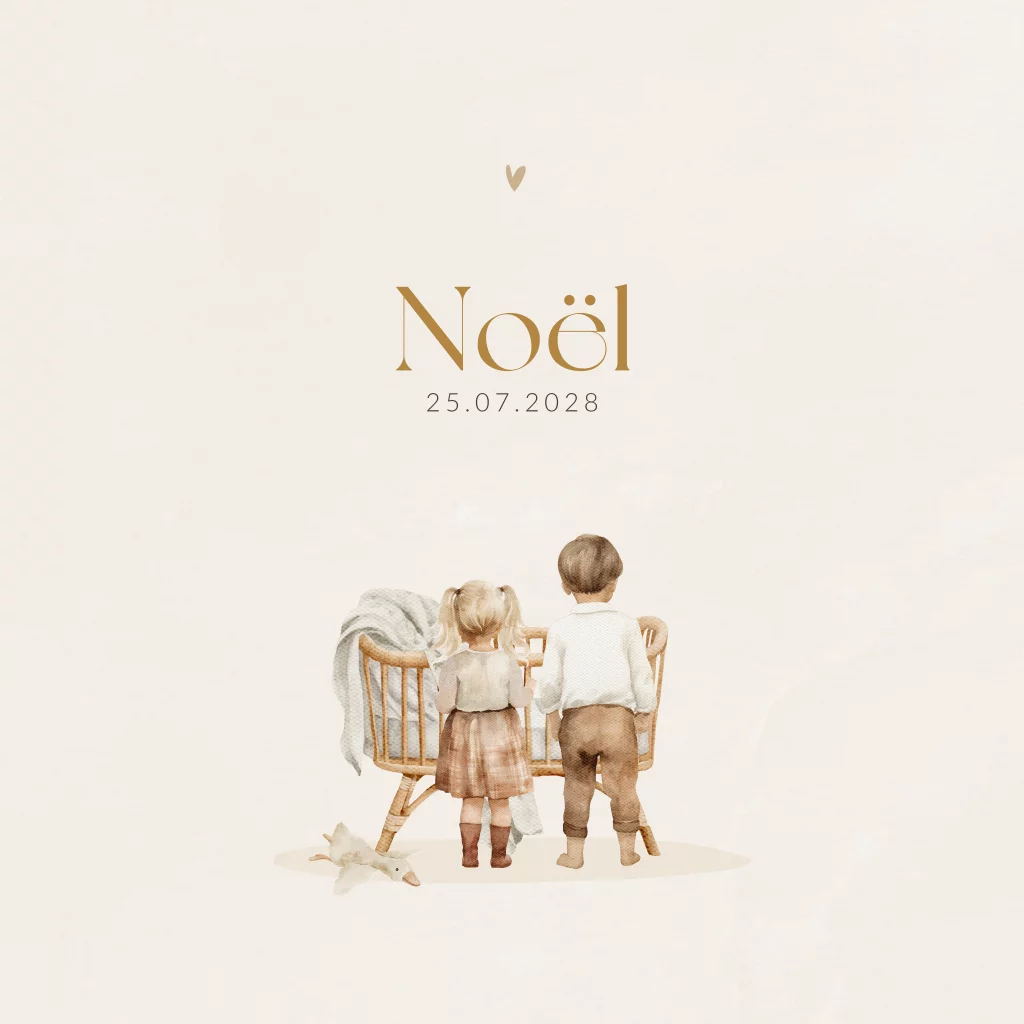 Prachtige aquarel getekend unisex geboortekaartje voor een jongen of meisje. Dit neutrale geboortekaartje is perfect voor de aankondiging van de geboorte van jullie derde kindje. De tekening toont een lieflijk tafereel van een grote broer en zus bij de wieg van hun kleine broertje of zusje. De zachte, aardse tinten van beige en bruin geven het geboortekaartje een rustige uitstraling. Dit geboortekaartje Noël is ideaal voor ouders die op zoek zijn naar een kaartje voor hun zoon of dochter.