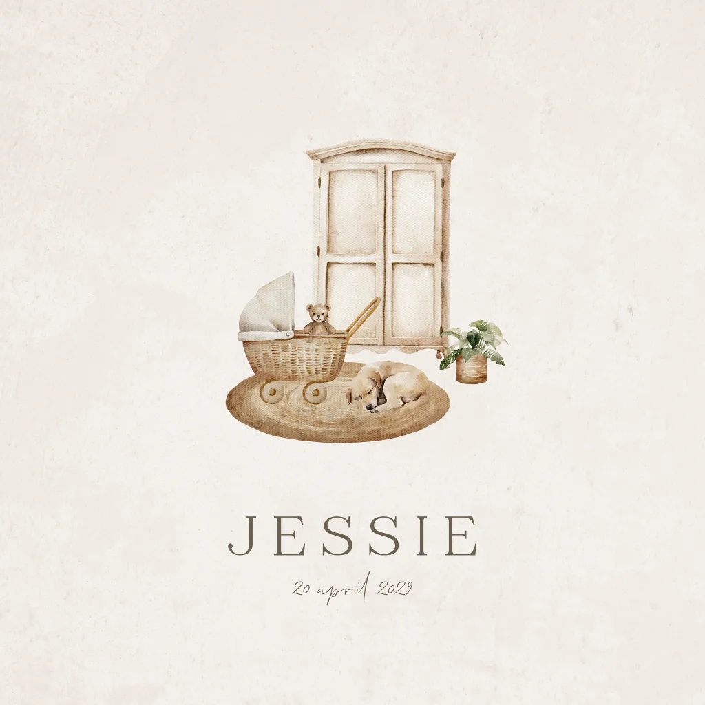 Dit prachtige unisex geboortekaartje met een aquarel tekening van een kinderwagen met teddybeer en een slapende hond is de perfecte keuze om de komst van jullie baby aan te kondigen. De zachte kleuren en illustratieve details geven het geboortekaartje een lief en vintage gevoel, waardoor het geschikt is voor zowel jongens als meisjes.
