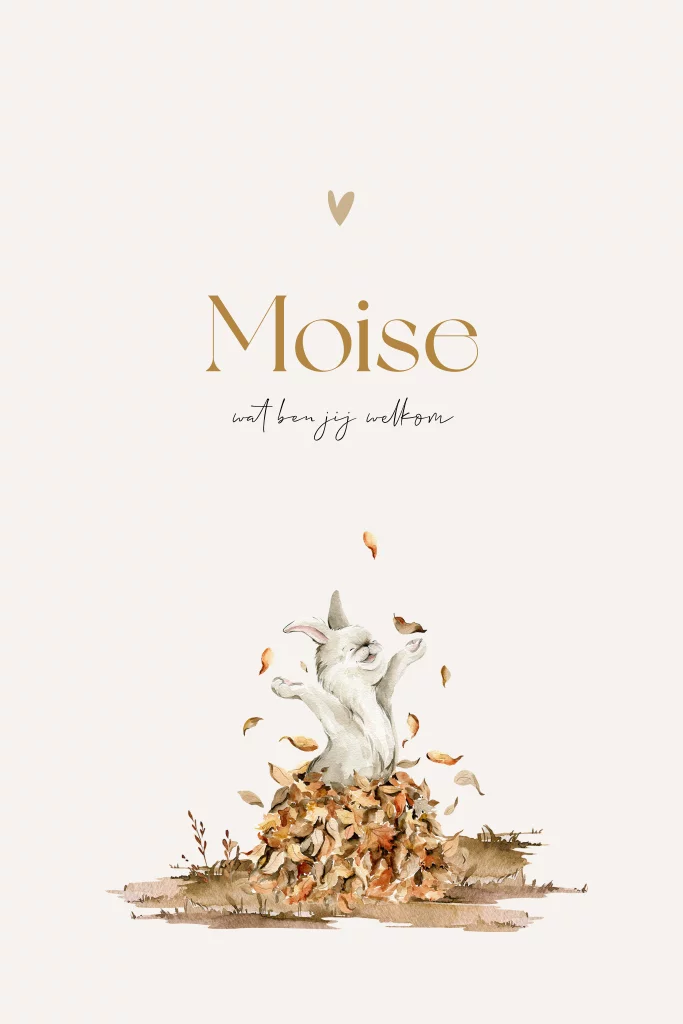 Prachtig geïllustreerd unisex geboortekaartje voor jullie zoon of dochter. Op dit geboortekaartje Moise zie je een lief aquarel geïllustreerd konijntje dat aan het spelen is in een bult met herfstbladeren. Het konijntje straalt plezier uit! Het geboortekaartje is vormgegeven in beige tinten en is daarom geschikt voor zowel een jongen als een meisje. In de online editor kun je het kaartje geheel naar eigen wens aanpassen.