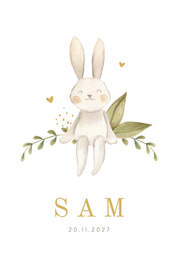Prachtig unisex geboortekaartje volgens de nieuwste trends. Op dit neutrale geboortekaartje Sam staat een illustratie van een konijn, zittend op een takje. Op de achtergrond kleine hartjes. Dit geboortekaartje is unisex, dus geschikt voor zowel een jongen als een meisje.