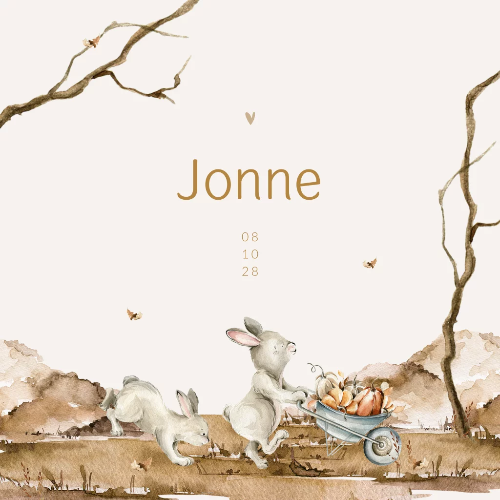 Het geboortekaartje Jonne is een unisex geboortekaartje en is daarom geschikt voor zowel een jongen als een meisje. De aardse tinten en het herfstachtige bosdesign geven een warm en natuurlijk gevoel aan het geboortekaartje. Op het geboortekaartje zie je twee schattige konijntjes die een kruiwagen vol met pompoenen vervoeren. Dit kaartje is perfect voor ouders die houden van de natuur, dieren en avontuurlijke elementen. De zandkleurige envelop maakt het geheel helemaal af. In de online editor kun je het geboortekaartje voor jullie zoon of dochter naar eigen wens aanpassen.