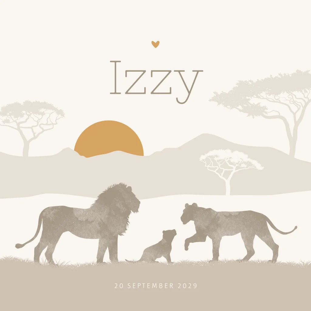 Jongens of meisjes geboortekaartje in een savanne landschap met ondergaande zon. Dit geboortekaartje Izzy is perfect voor een avontuurlijke baby. Je ziet een leeuw en leeuwin met hun kleine welpje in de savanne. Het geboortekaartje is genderneutraal, met een silhouet van een leeuwen familie in dezelfde natuurlijke beige en bruine kleuren als de achtergrond. Dit safarikaartje is unisex, dus het is perfect voor een jongen of een meisje. Pas dit babykaartje geheel naar eigen wens aan in de editor. Hulp nodig? Wij helpen je graag!