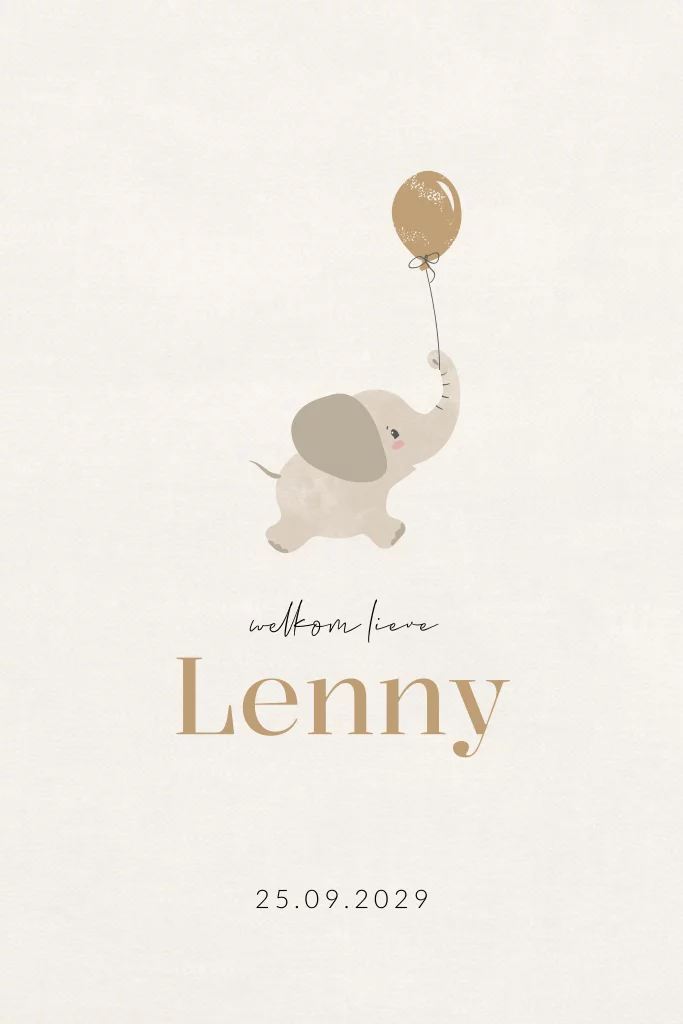 Lief genderneutraal geboortekaartje voor een jongen of een meisje. Dit unisex geboortekaartje Lenny heeft een schattig design van een olifantje die een ballon vasthoudt met zijn slurf. Het kaartje heeft een rustig design met rustige kleurtinten.
