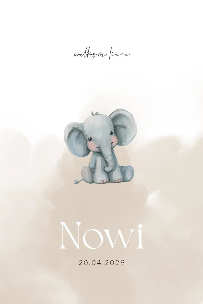 Lief genderneutraal geboortekaartje voor een jongen of meisje. Dit unisex geboortekaartje Nowi heeft een schattig design van een baby olifantje in aquarel. Het kaartje heeft een rustig design in beige kleurtint met afgeronde hoeken. Kies voor de bijpassende sluitzegel om er één geheel van te maken.