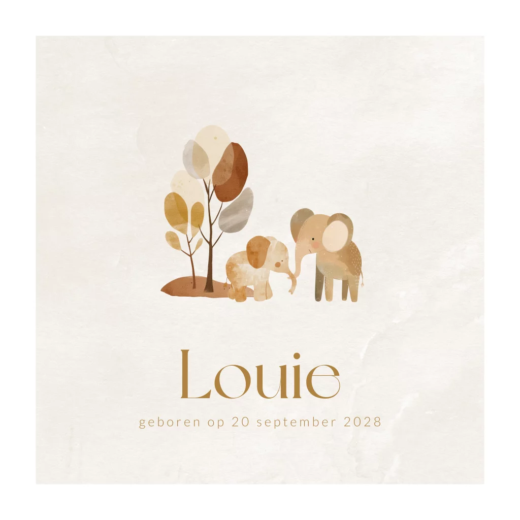 Dit prachtige geboortekaartje met een aquarel tekening is perfect voor ouders die op zoek zijn naar een unisex ontwerp voor hun eerste of tweede kindje. Je ziet een rustig ontwerp van twee olifantjes met een omrand kader. De combinatie van beige en bruin zorgt voor een warme sfeer, ook perfect voor een herfst baby.