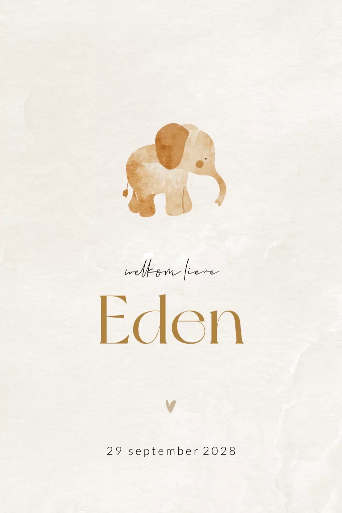 Lief genderneutraal geboortekaartje voor een jongen of meisje. Dit unisex geboortekaartje Eden heeft een schattig design van een olifantje in aquarel. Het kaartje heeft een rustig design met afgeronde hoeken.