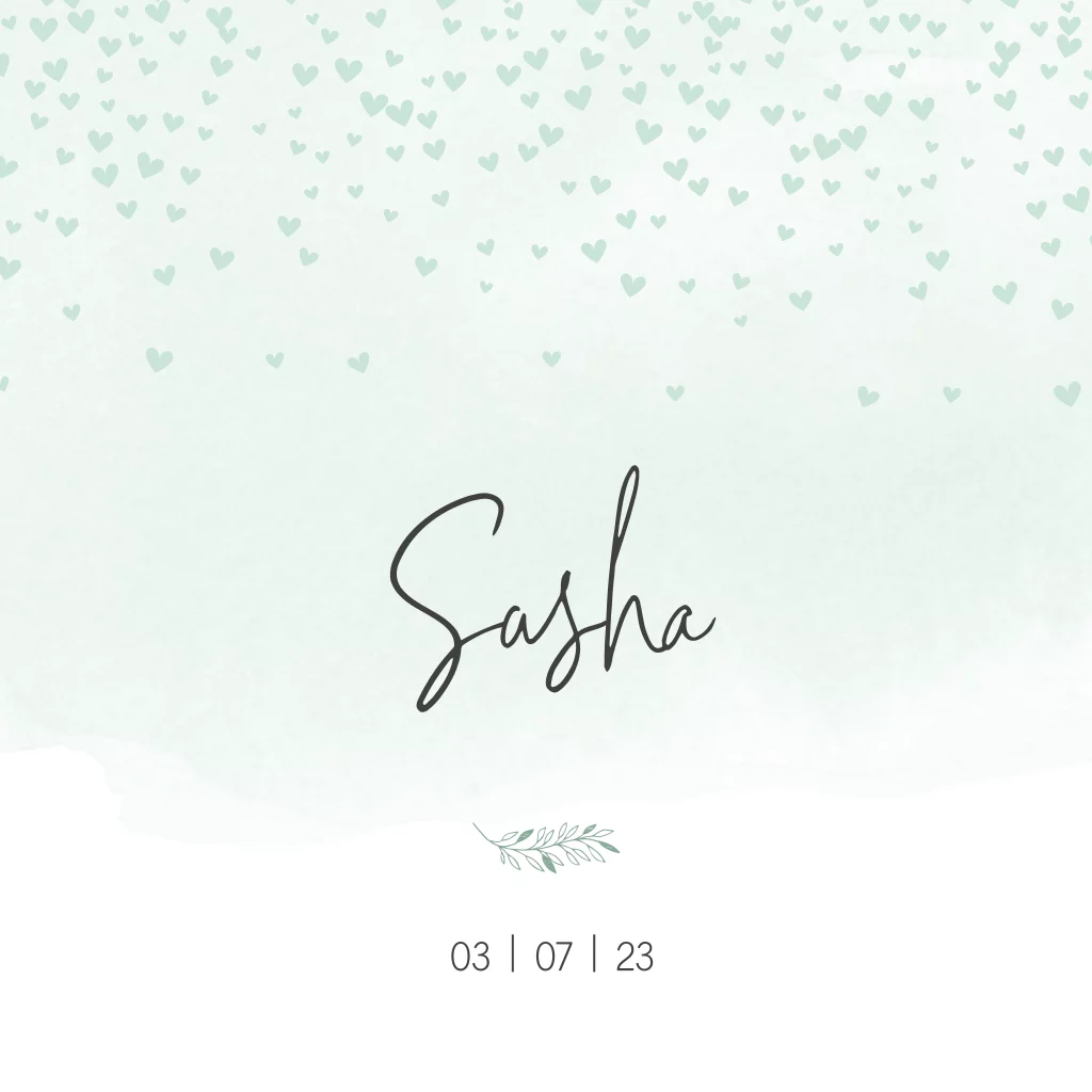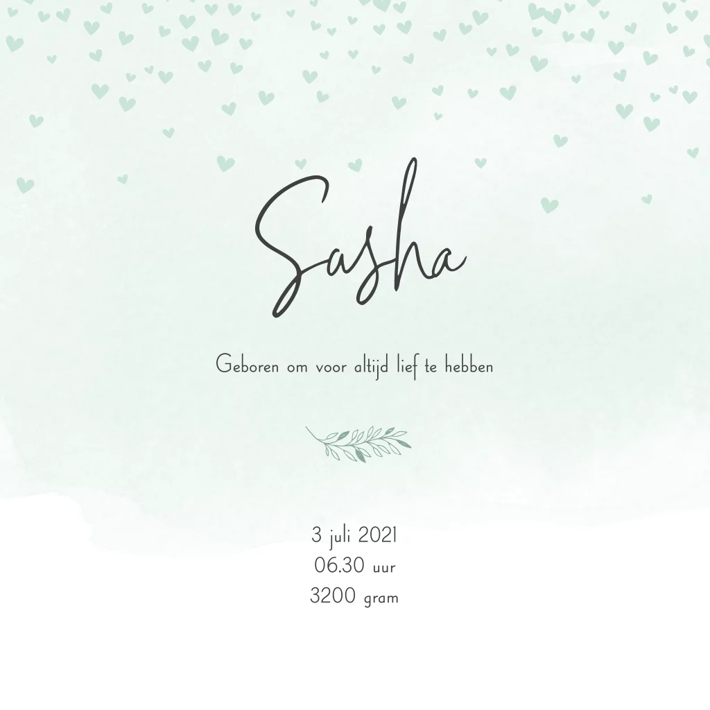 Rustig uniseks geboortekaartje met aquarel achtergrond, een takje en kleine hartjes. Dit babykaartje kun je voor zowel een jongen als meisje gebruiken. De zachte groene kleur is eenvoudig aan te passen.
