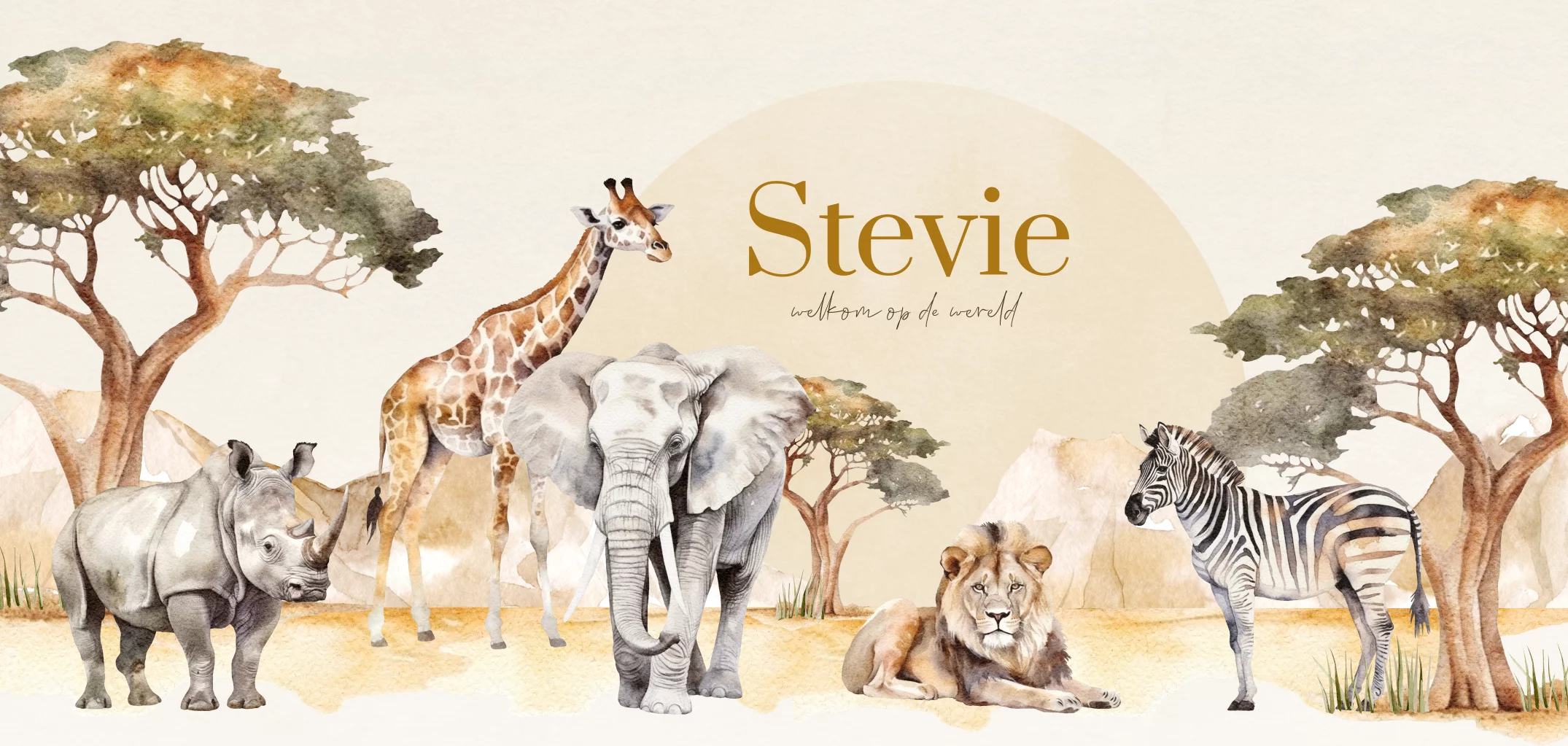 Unisex geboortekaartje met aquarel safari dieren. Op dit panorama kaartje Stevie voor zowel een jongen als een meisje staan verschillende dieren uit de jungle zoals een olifant, leeuw, zebra, giraf en neushoorn. Dit geboortekaartje heeft rustige natuurtinten.