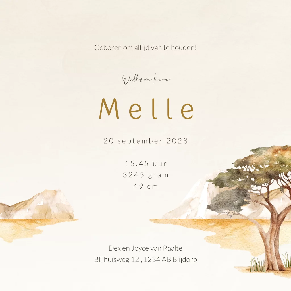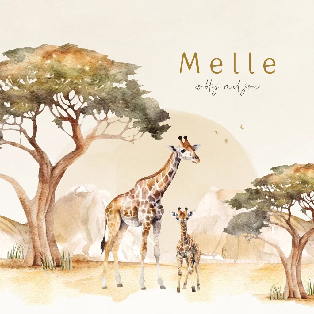 Safari geboortekaartje met 2 giraffen op de savanne. Dit geboortekaartje Melle heeft een beige achtergrond met op de voorgrond 2 bomen. Op de achtergrond staat een ondergaande zon. Door de rustige kleuren is dit babykaartje geschikt voor zowel een jongen als een meisje. Pas de kleuren en lettertypes eenvoudig zelf aan in onze editor.