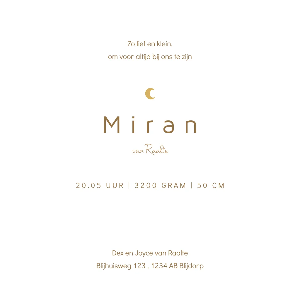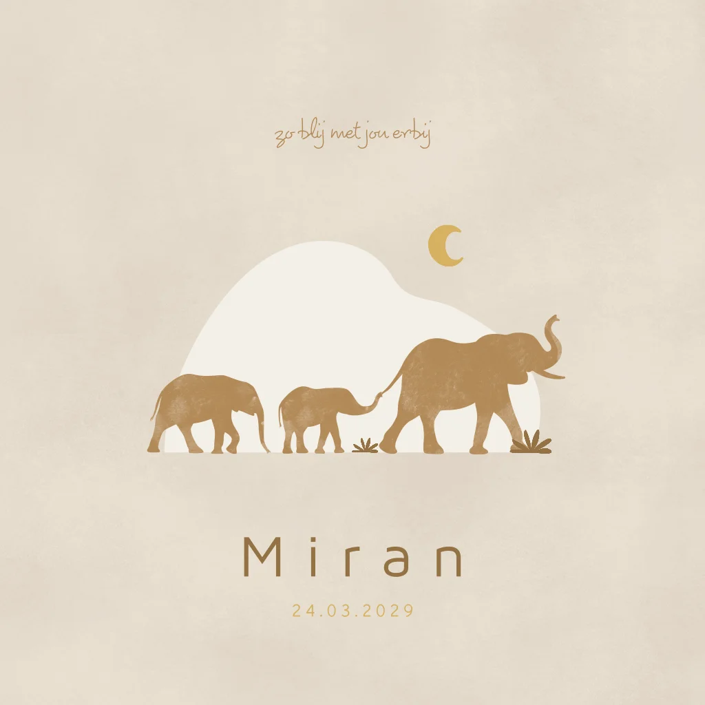 Vind het perfecte geboortekaartje voor je tweede of derde kindje met dit unisex babykaartje met drie aquarel olifanten. Op de achtergrond een organische vorm met maan. Dit neutrale ontwerp in zachte bruintinten is geschikt voor zowel een jongen als een meisje. De teksten en kleuren van dit geboortekaartje Miran kunnen eenvoudig worden aangepast in de online editor.