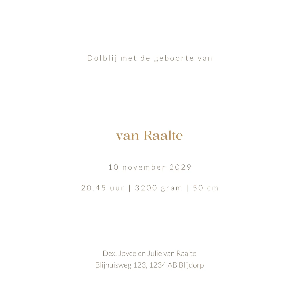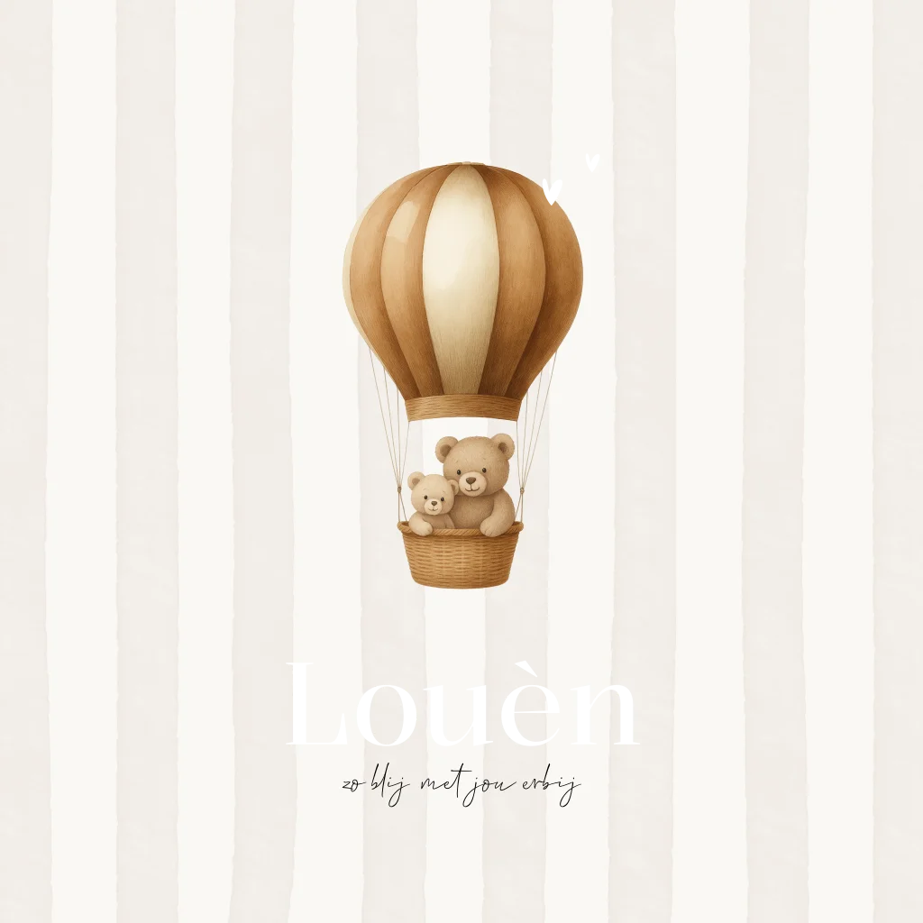 Op zoek naar een uniek geboortekaartje voor jullie zoon of dochter? Bekijk dan dit neutrale geboortekaartje met een grote en kleine beer in een luchtballo. Op dit geboortekaartje Louèn zie je twee beertjes in een luchtballon met een gestreepte achtergrond. De kleuren van het kaartje zijn rustig en neutraal, het geboortekaartje is hierdoor geschikt voor zowel een jongen als een meisje. Het goudfolie geeft een exclusieve uitstraling aan dit lieve geboortekaartje met beren. Alle is geheel naar eigen wens aan te passen in de editor.