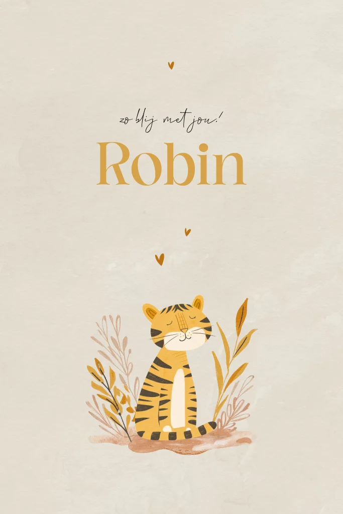Lief unisex geboortekaartje met een tijger met jungle takjes en hartje. Dit geboortekaartje is geschikt voor zowel jongens als meisjes. Je kunt deze kaart Robin naar je eigen wensen aanpassen in de editor. Hulp nodig bij het ontwerpen? Neem contact met ons op!
