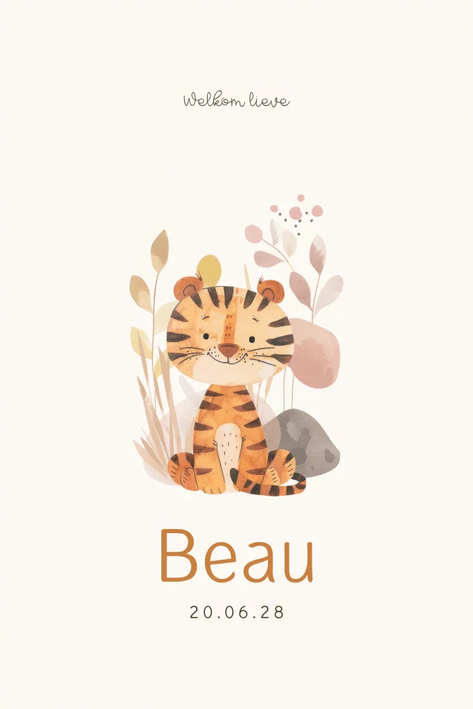 Dit geboortekaartje Beau heeft een beige achtergrond met een schattig geïllustreerd tijgertje in de jungle. De neutrale kleuren geven dit geboortekaartje een rustige uitstraling. Pas het kaartje eenvoudig aan naar jouw eigen wensen in de editor.