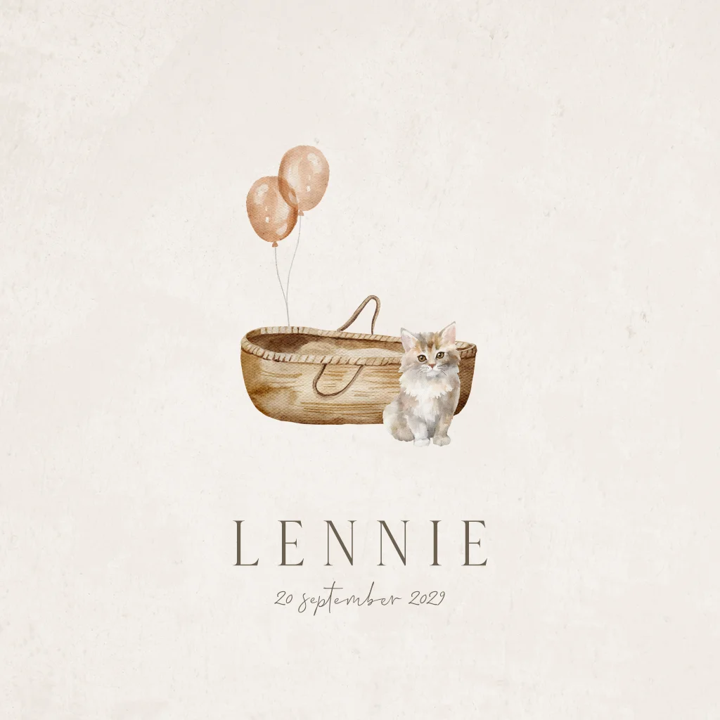 Dit prachtige unisex geboortekaartje met een aquarel schildering van een wieg, kat en ballonnen is perfect voor de aankondiging van de geboorte van jullie kindje. De zachte tinten beige en bruin geven het kaartje een rustige uitstraling. Of jullie nu een zoon of dochter verwachten, dit unisex geboortekaartje is geschikt voor beide.