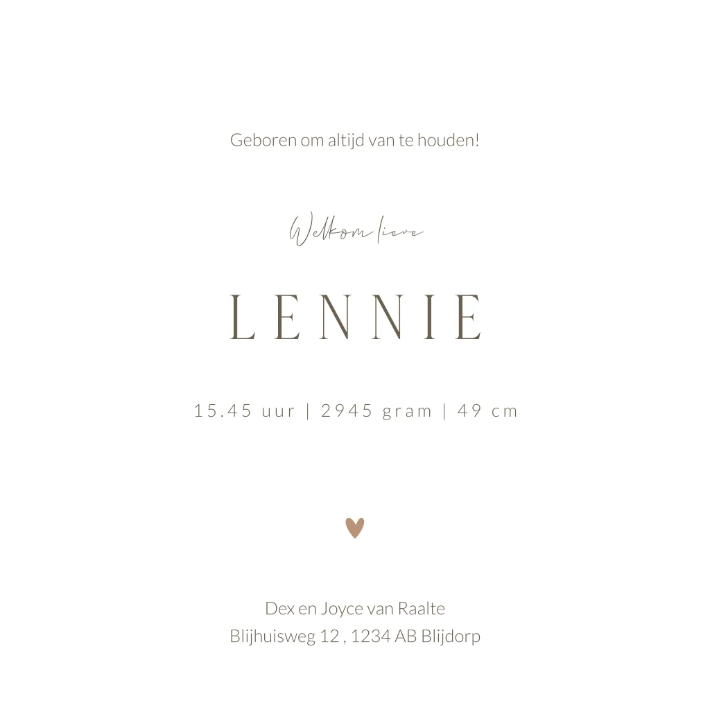 Pas dit geboortekaartje Lennie gemakkelijk aan in de editor. Hulp nodig? Bel, mail of chat ons gerust.
