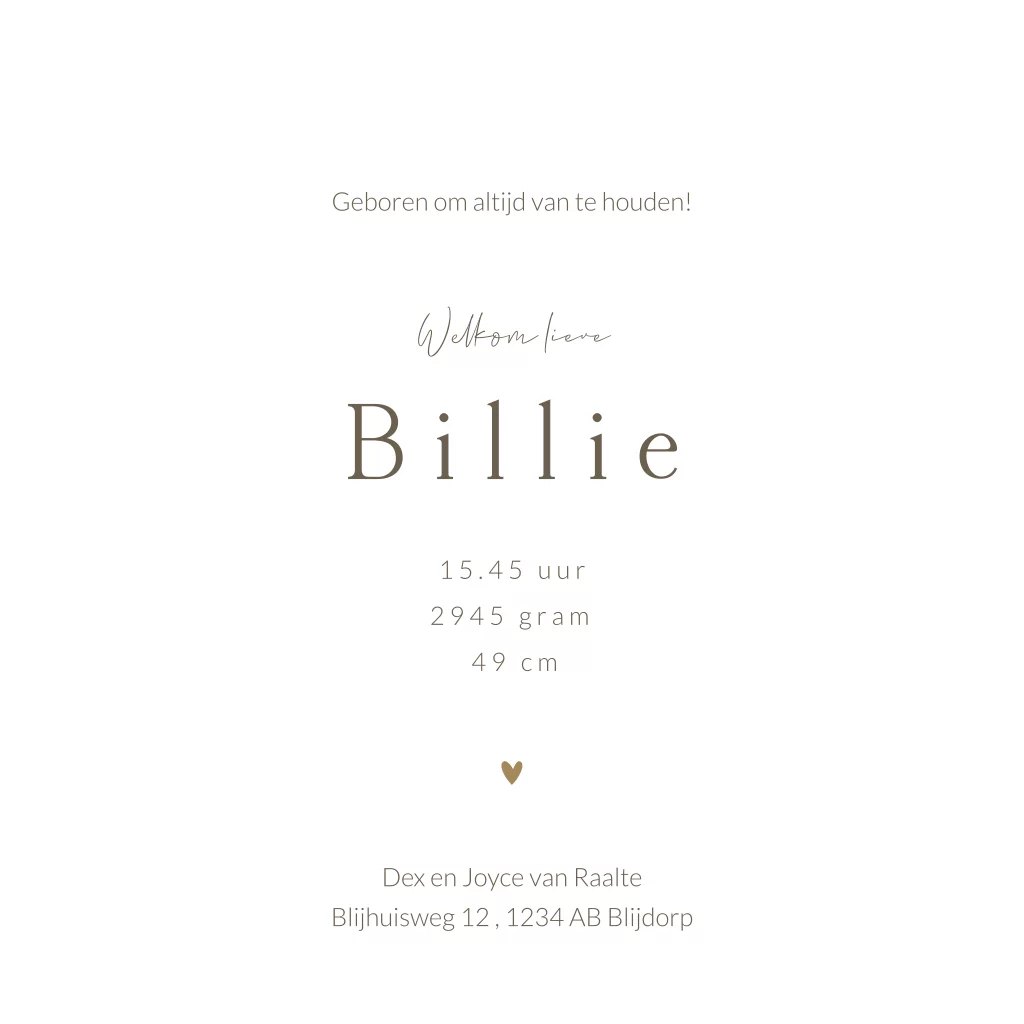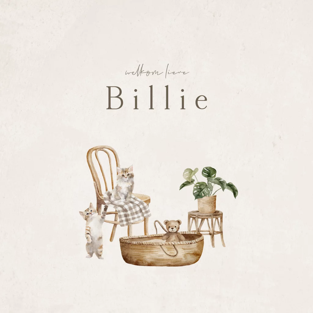 Dit unisex geboortekaartje met een aquarel tafereeltje van een wieg en schattige katten is perfect voor de aankondiging van de geboorte van jullie kindje. Door de neutrale kleuren is dit geboortekaartje Billie unisex en daardoor geschikt voor zowel een jongen als een meisje. Dit kaartje is perfect voor echte kattenliefhebbers die graag hun huisdier willen betrekken bij het geboortekaartje.