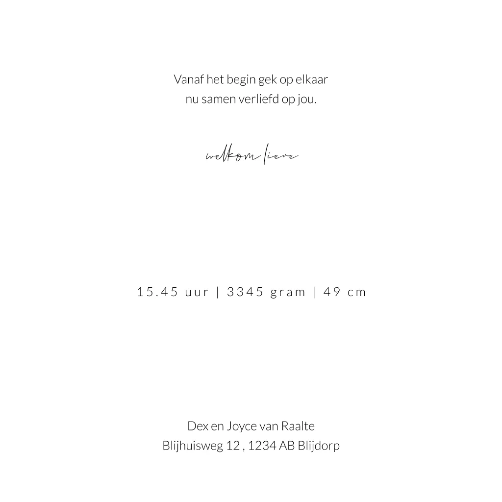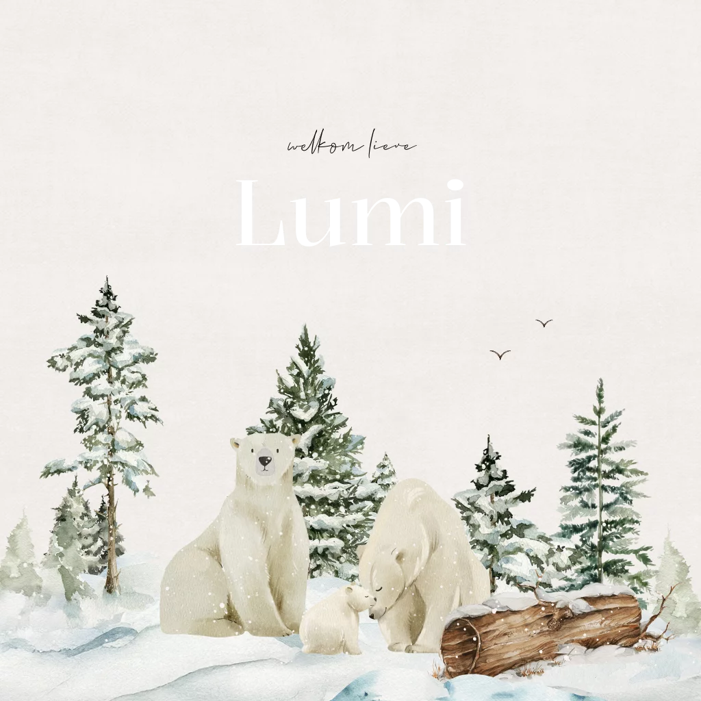 Dit prachtige unisex geboortekaartje Lumi met een aquarel ontwerp van een ijsberen familie in de sneeuw is een unieke manier om de komst van jullie zoon of dochter aan te kondigen. De toevoeging van het winterse landschap met bomen en sneeuw zorgt voor een sfeervol winterse uitstraling. Perfect dus voor een echte winter baby! De foliedruk heeft een mooie glans en geeft dit geboortekaartje voor een jongen of meisje een extra luxe uitstraling.