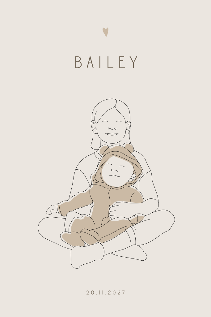 Hoera een broertje of zusje geboren! Vier de geboorte van jullie zoon of dochter met dit hippe en trendy geboortekaartje. Op dit neutrale babykaartje Bailey een prachtige lijntekening van een baby op schoot bij de grote zus, speciaal ontworpen door onze designers. Pas dit kaartje geheel naar je eigen smaak aan in de editor.