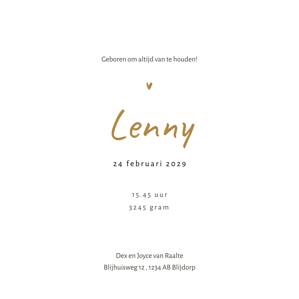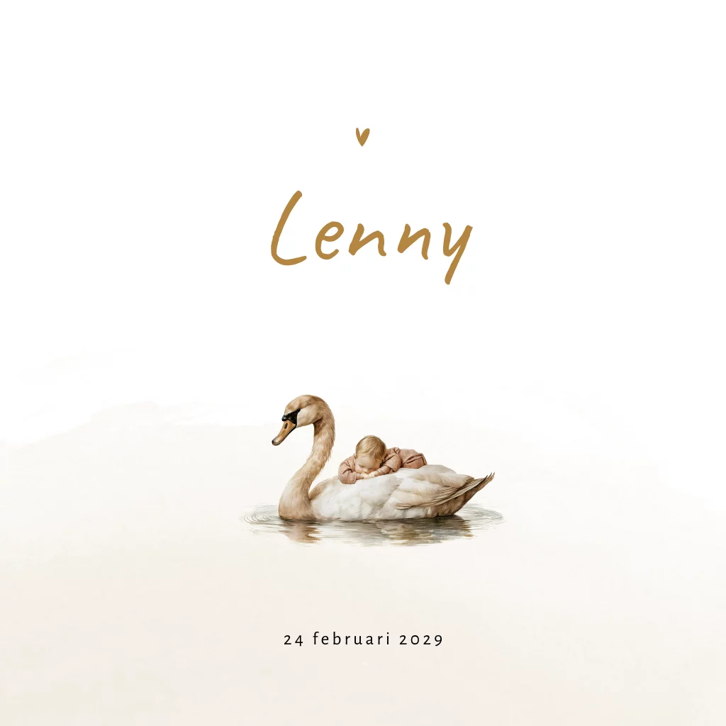 Dit geboortekaartje Lenny is perfect voor ouders die op zoek zijn naar een schattig ontwerp voor hun nieuwe kleine wonder. De neutrale kleuren zoals beige en bruin maken dit geboortekaartje unisex en daardoor perfect voor zowel jongens als meisjes. Dit geboortekaartje is voorzien van een illustratie van een zwemmende zwaan met een baby´tje op de rug. Pas de teksten, lettertypes en kleuren eenvoudig aan in de editor. Hulp nodig bij het ontwerpen van het geboortekaartje van jullie zoon of dochter? Neem contact met ons op!