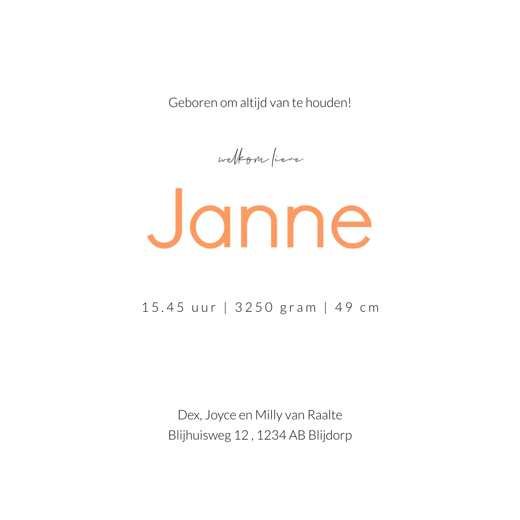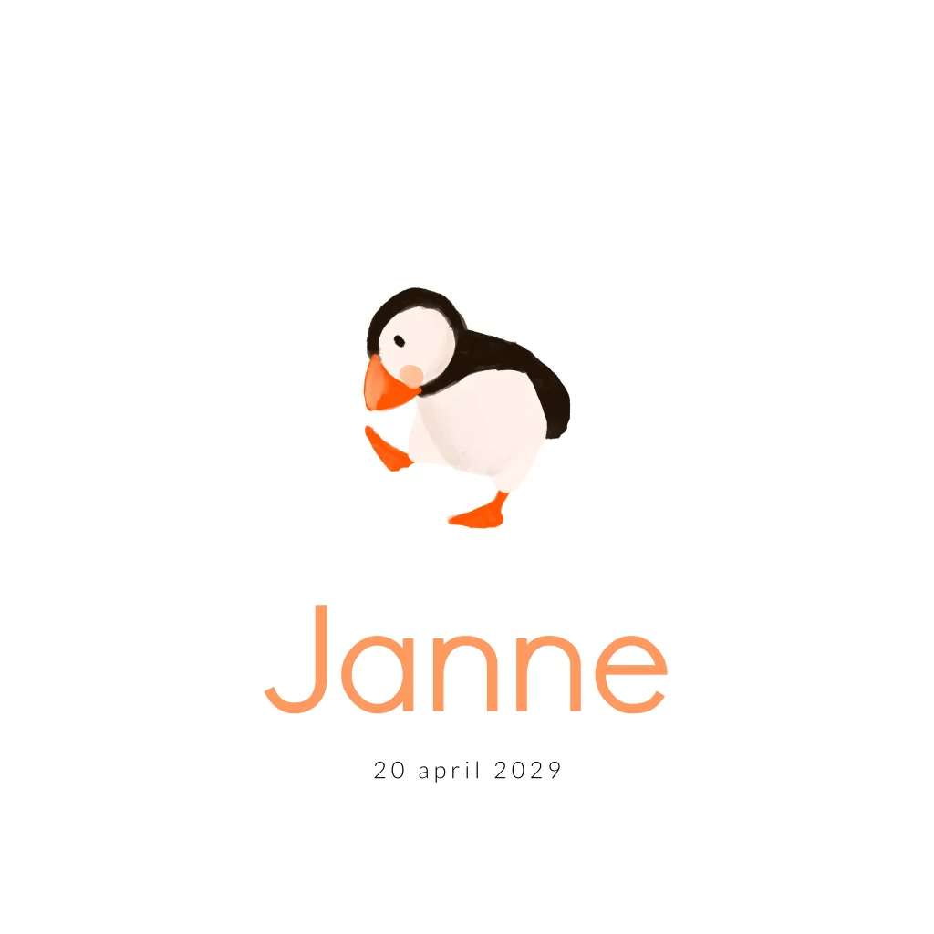 Dit prachtige geboortekaartje Janne is perfect voor ouders die op zoek zijn naar een unisex ontwerp voor een jongen of een meisje. Je ziet een basic ontwerp van een papegaaiduiker met daaronder de babynaam op een witte achtergrond. Dit schattige en rustige geboortekaartje is aan te passen in onze online editor, zodat je het kaartje extra persoonlijk kunt maken. Hulp nodig met het ontwerpen van een geboortekaartje voor jullie zoon of dochter? Ons team helpt je graag!