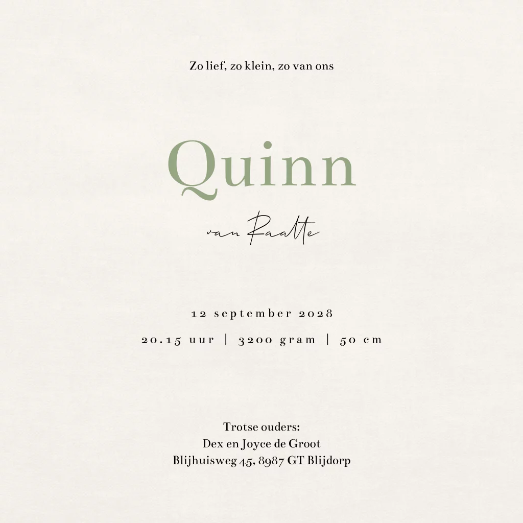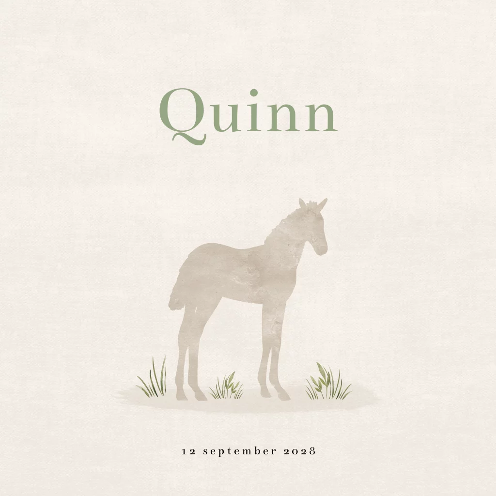 Zijn jullie gek van paarden? Dan is dit unisex geboortekaartje met een silhouet van een veulen perfect voor jullie zoon of dochter. Door de neutrale kleuren is dit geboortekaartje Quinn geschikt voor zowel een jongen als een meisje en kun je naar eigen smaak aanpassen in de editor. Hulp nodig? We helpen graag!