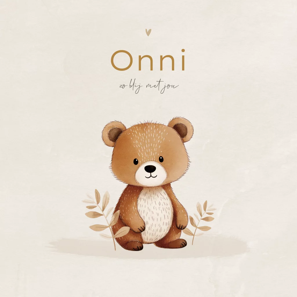 Unisex geboortekaartje voor een meisje of jongen met een lief beertje. Dit geboortekaartje Onni heeft een rustig design met neutrale kleuren.