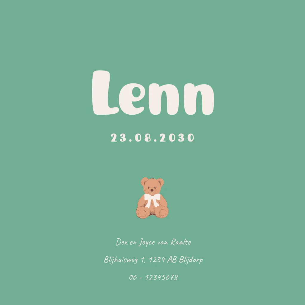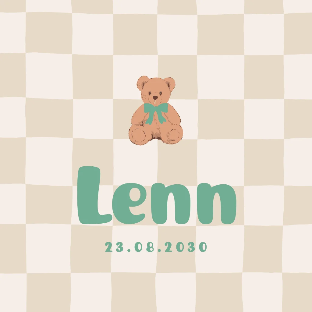 Unisex geboortekaartje met een beige blokjespatroon en een lief beertje met strikje. In stoere speelse letters staat de babynaam Lenn. Pas de kleuren, teksten en lettertypes eenvoudig aan in de editor.