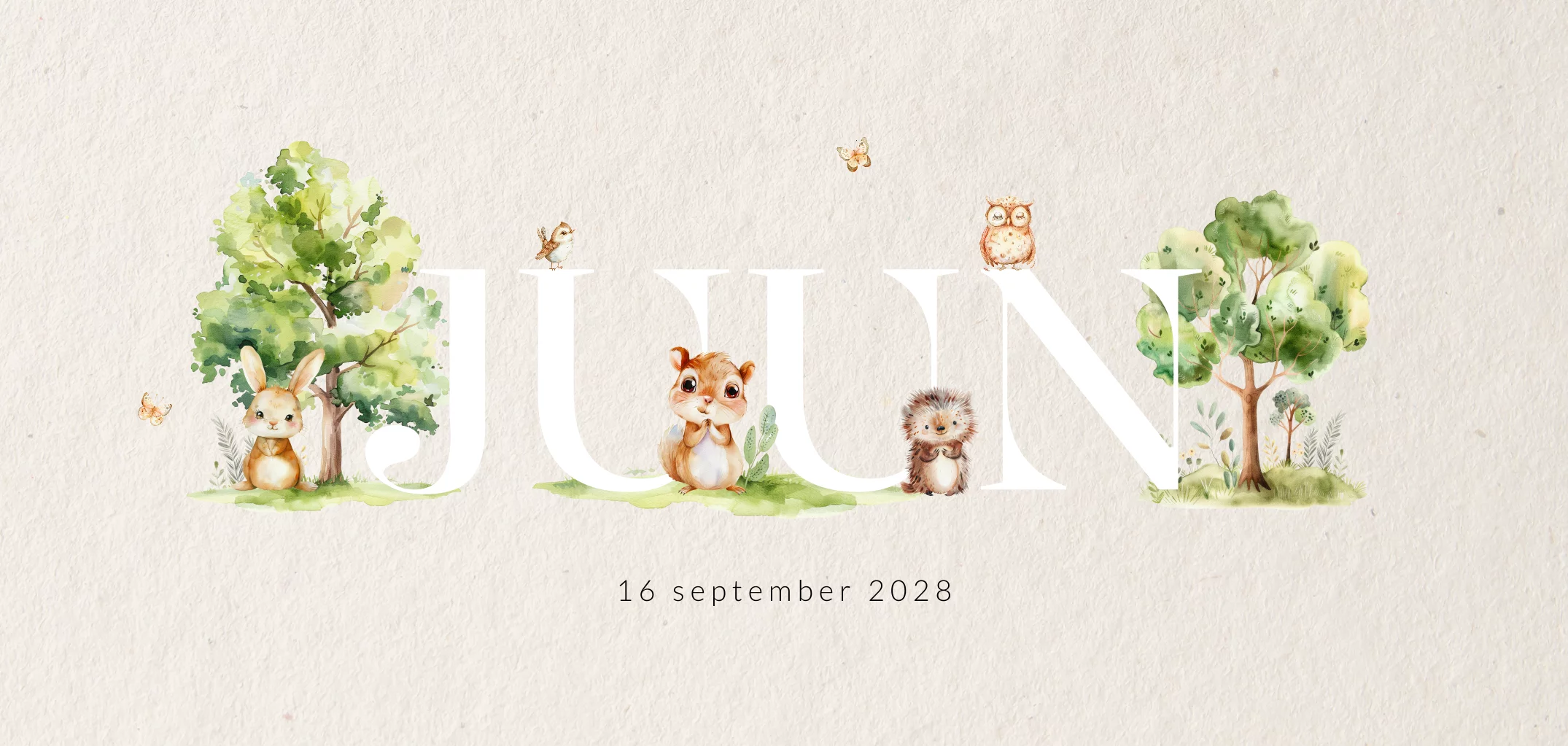 Een geboortekaartje voor een jongen of een meisje met een schattig bosdieren design. Op dit geboortekaartje zie je schattige geïllustreerde bosdieren tussen de letters van de babynaam staan. Dit geboortekaartje Juun heeft een rustige uitstraling door de beige tint en de toegevoegde oud papierenlook achtergrond. Pas de teksten, lettertypes en kleuren eenvoudig aan in de editor voor de geboorte van jullie zoon of dochter.