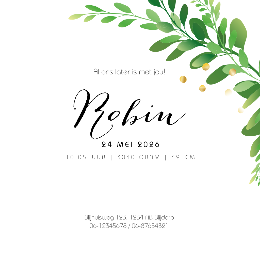 Botanisch unisex geboortekaartje met eigen foto. Deze kaart met aquarel en gouden stippen is zowel geschikt voor een jongen als een meisje.