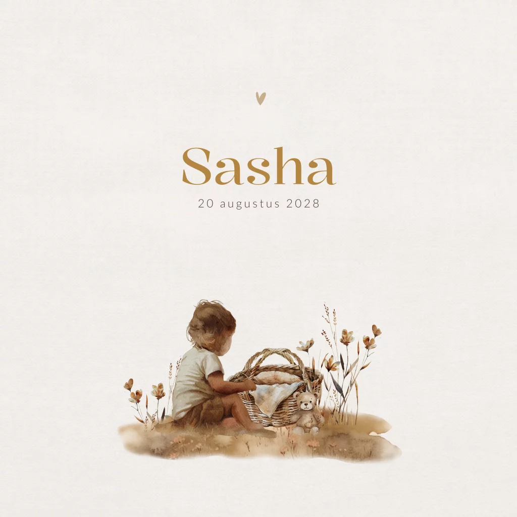 Op dit neutrale geboortekaartje Sasha vind je een prachtig getekende aquarel illustratie van een broertje bij een rieten mand. De rieten mand is voor het broertje of zusje, een tweede kindje. Om de mand heen zie je prachtige veldbloemen en een schattige teddybeer. Het subtiele hartje boven de naam van jullie zoon of dochter maakt het kaartje helemaal af.