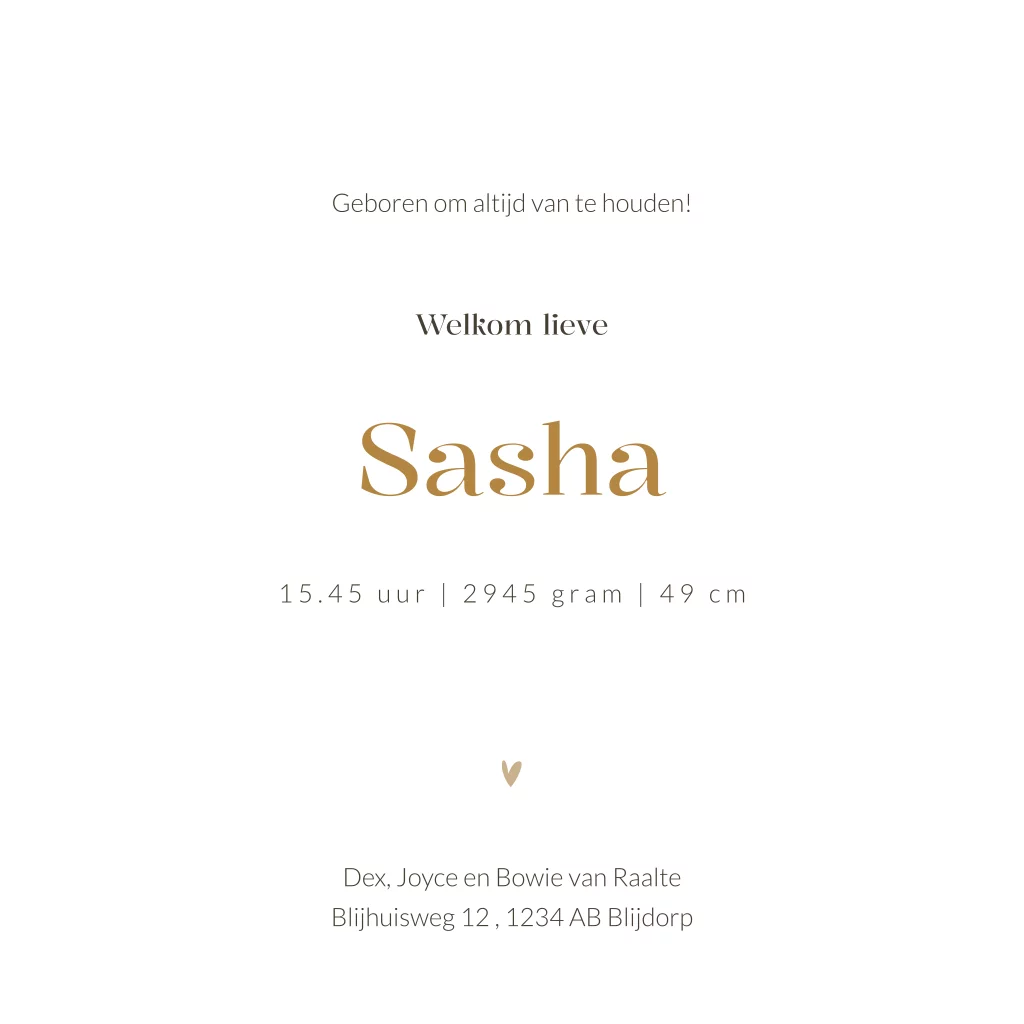 In de online editor kun je deze geboortekaart Sasha naar eigen wens aanpassen. Dit kaartje is ook mogelijk in een andere gezinssamenstelling.