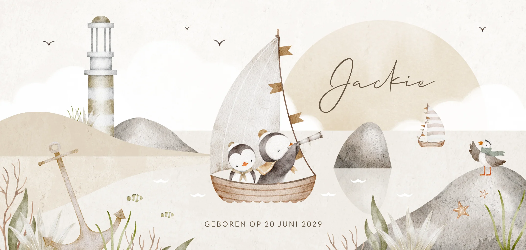 Unisex geboortekaartje voor een tweede kindje, een broertje of zusje. Dit geboortekaartje Jackie heeft neutrale kleuren en is voorzien van een mooie aquarel illustratie met strand, vuurtoren en twee pinguïns in een bootje. Pas de kaart geheel naar eigen wens aan in de editor.