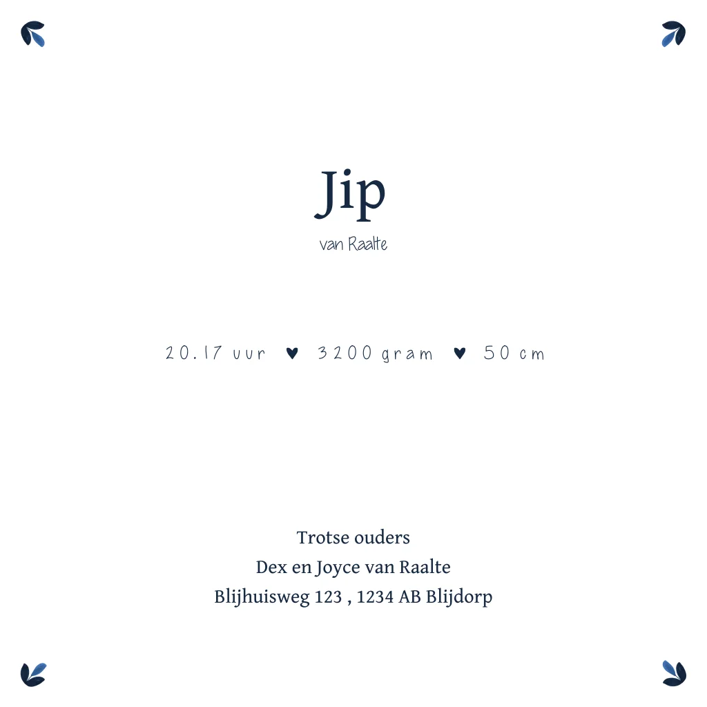 Oud Hollands geboortekaartje als Delfts blauw tegeltje. Op dit unisex geboortekaartje Jip staan verschillende boerderijdieren. Het kaartje heeft een unieke uitstraling met verschillende dieren in een Delfts blauwe kleur. Helemaal leuk voor gezinnen die op een boerderij wonen en dit thema willen doortrekken. Dit geboortekaartje pas je geheel naar eigen wens aan in de editor. Hulp nodig? We staan voor je klaar! Bel, mail of chat gerust.