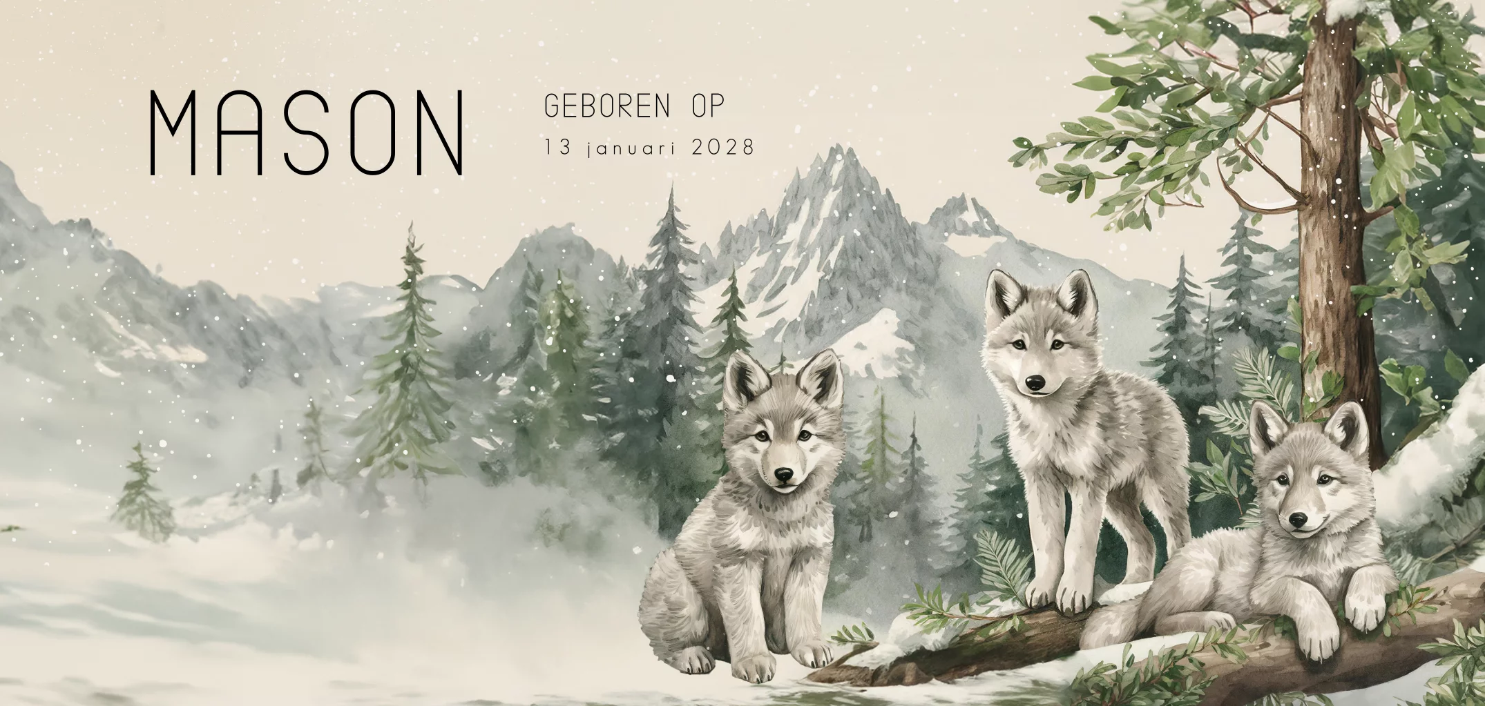Een prachtig winters geboortekaartje voor een derde kindje. Dit kaartje Mason straalt één en al avontuur uit. Op dit kaartje zie je drie wolven welpjes in de sneeuw in het bos. Op de achtergrond zie je de bergen. Het gebruik van dierlijke illustraties en neutrale kleuren zoals beige, bruin en groen maakt dit kaartje geschikt voor zowel een jongen als een meisje. Pas dit stoere kaartje voor jullie zoon of dochter eenvoudig aan in onze online editor om het helemaal eigen te maken.